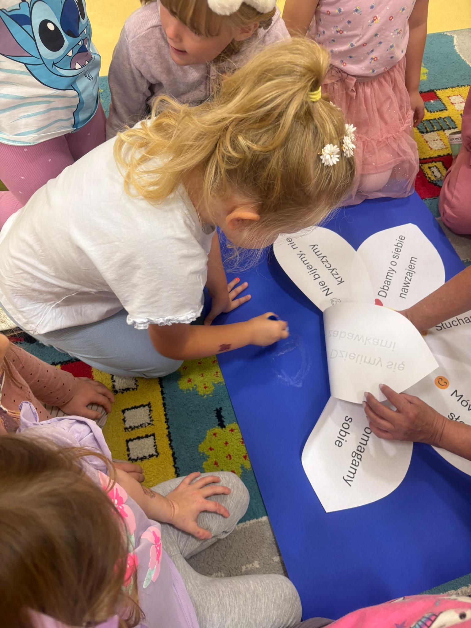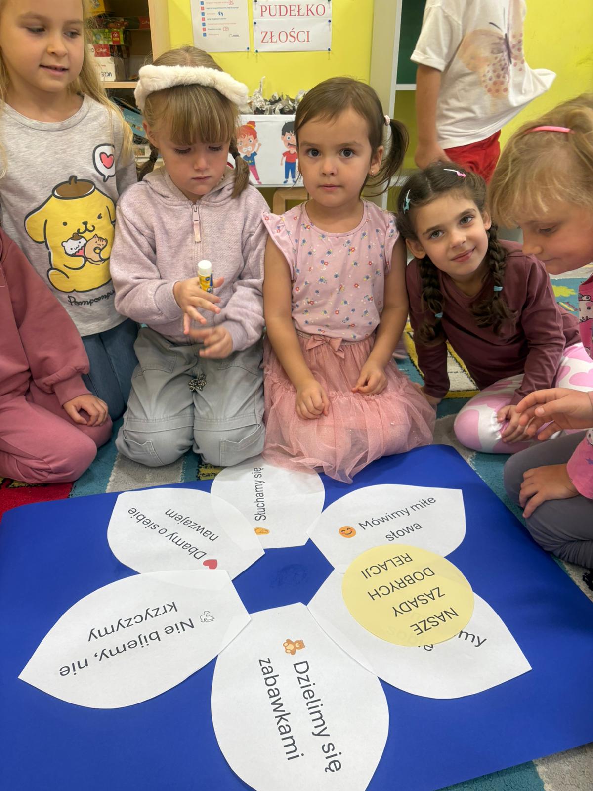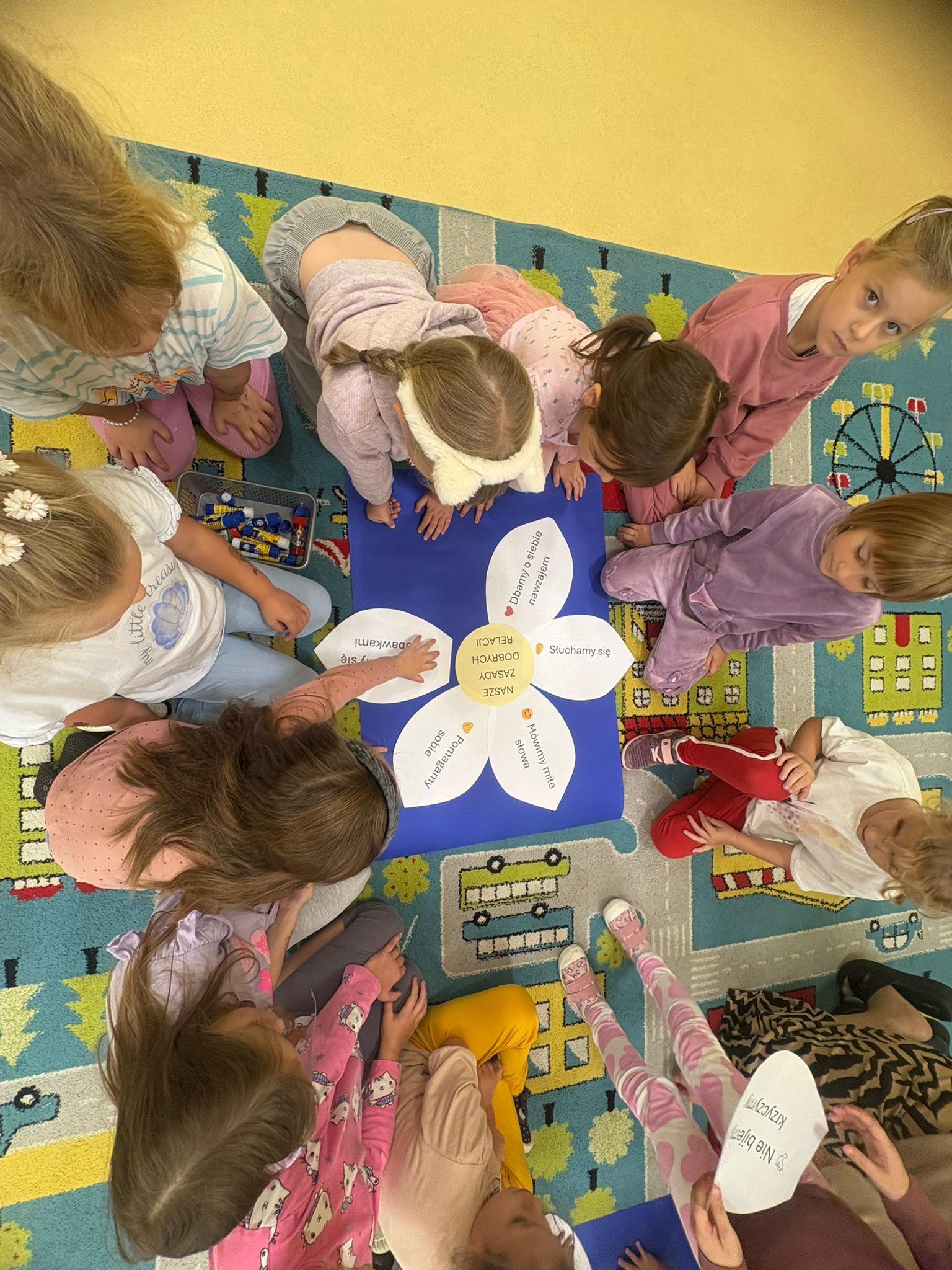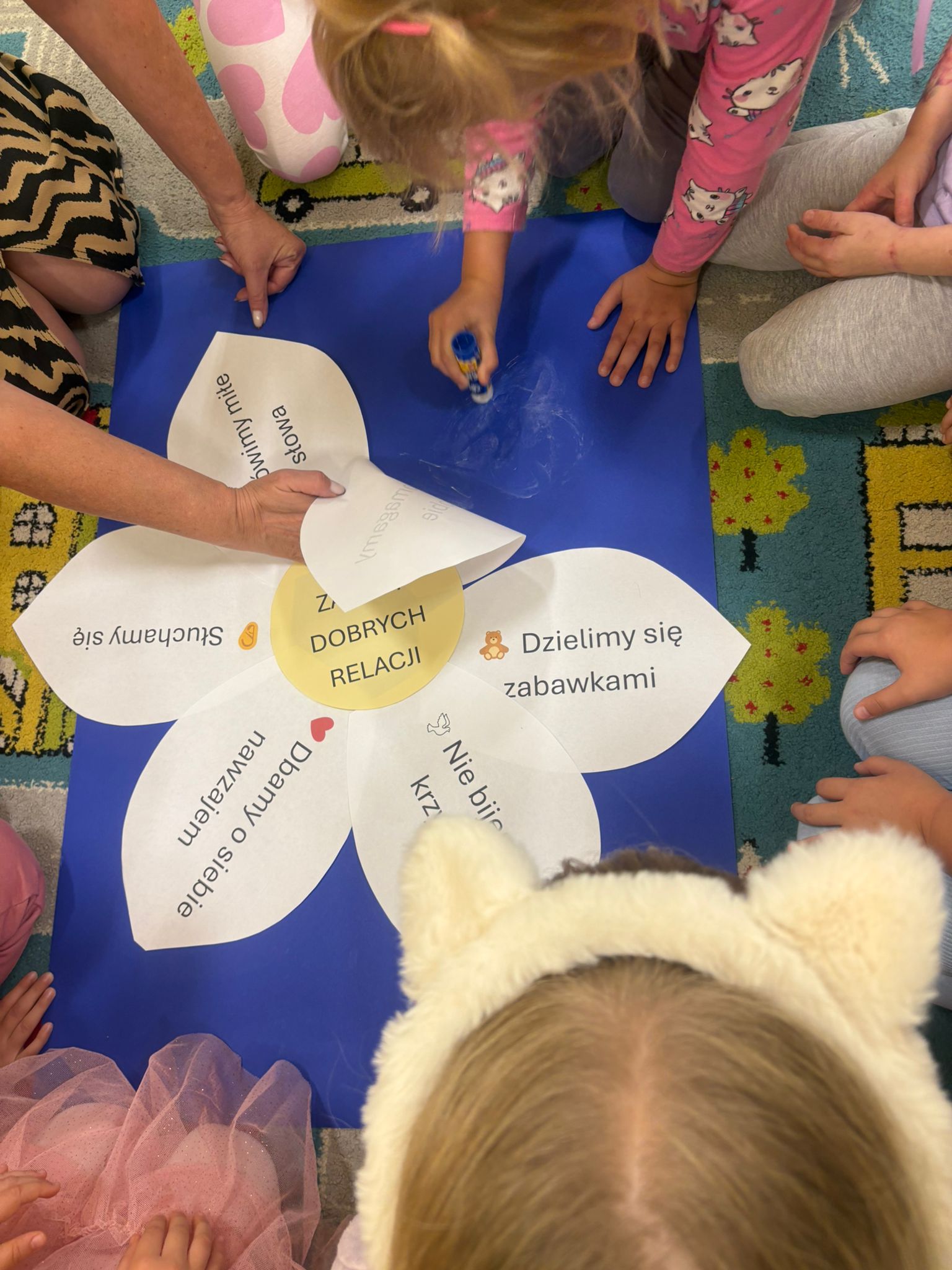 W grupie stokrotki rozmawialiśmy o tym, jak budować dobre relacje z innymi. Dzieci dzieliły się pomysłami, jak być dobrym przyjacielem — mówiły o dzieleniu się, pomaganiu i miłych słowach. Na zakończenie stworzyliśmy wspólną pracę plastyczną: Stokrotkę Dobrych Relacji . Każdy płatek to jedna zasada przyjaźni, wymyślona przez dzieci.