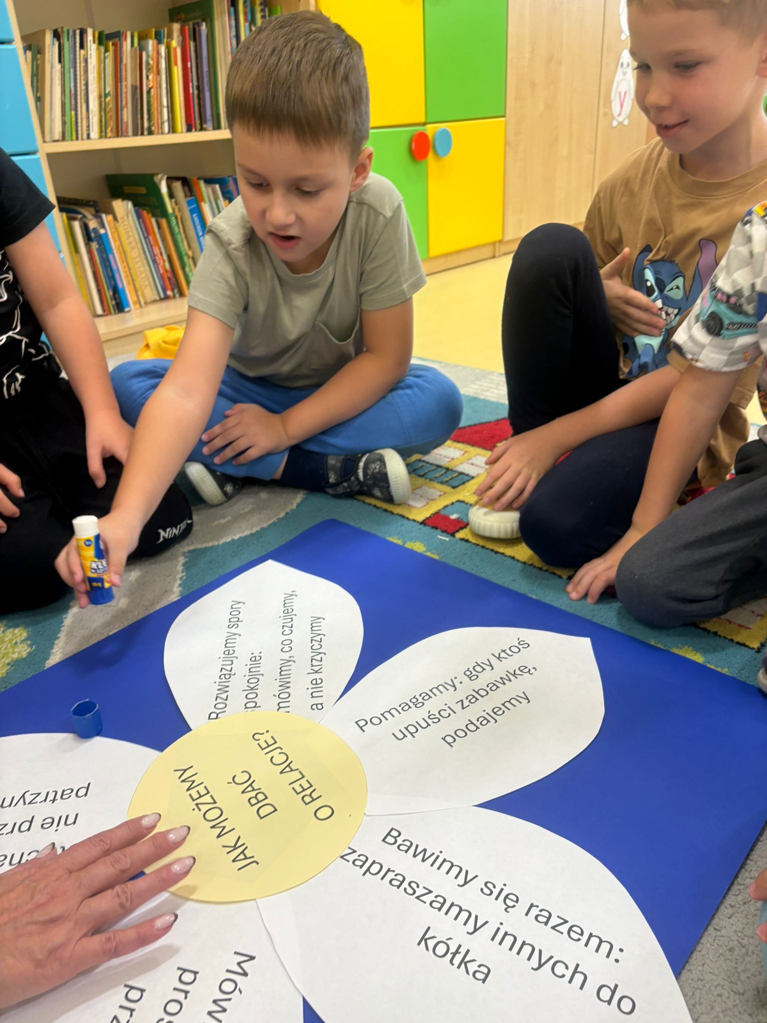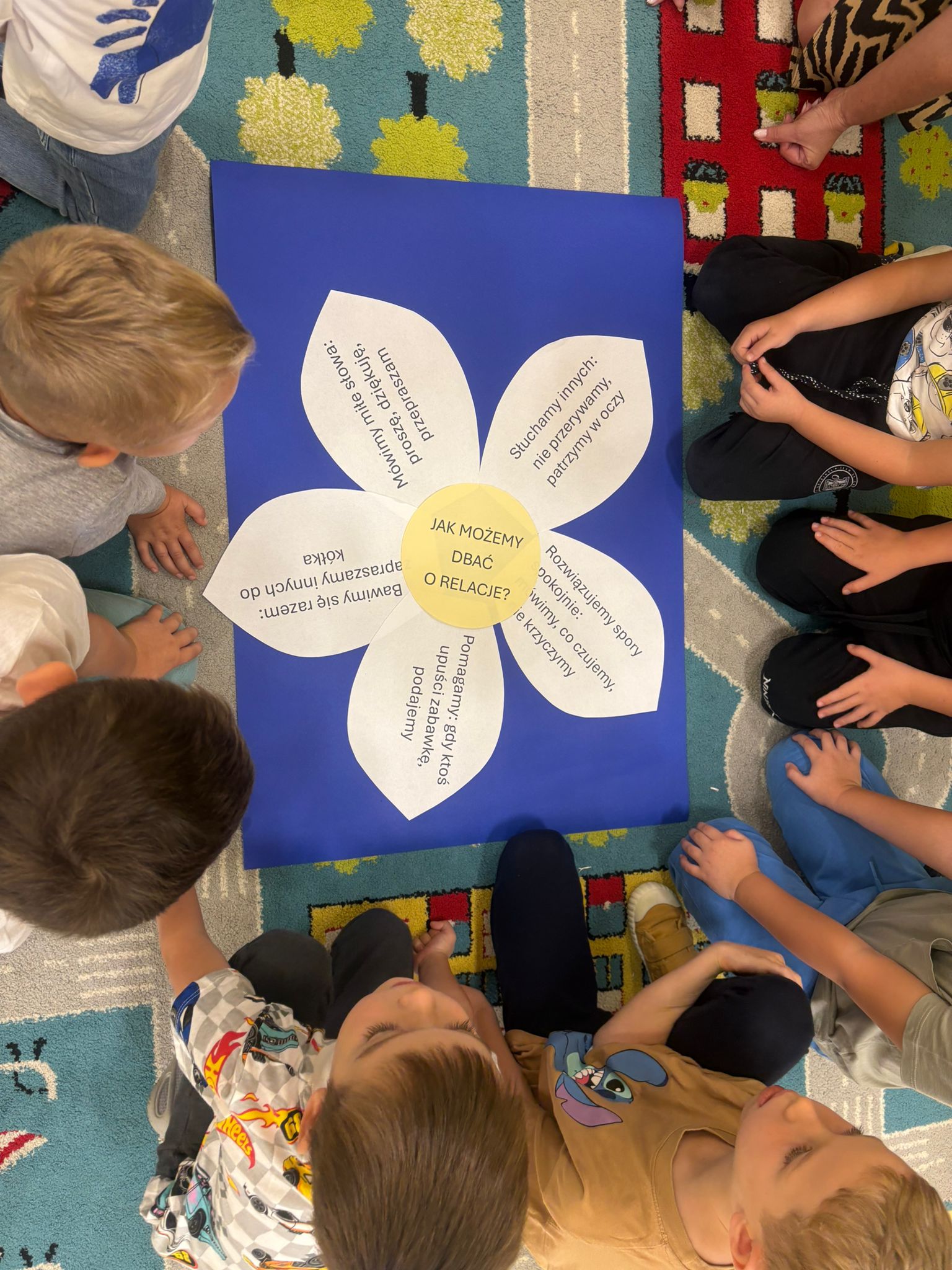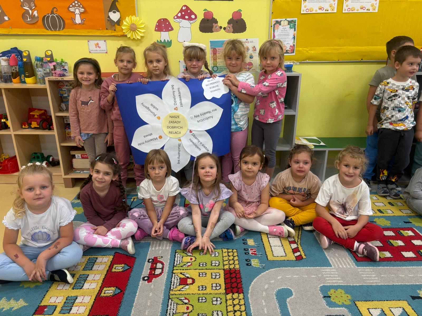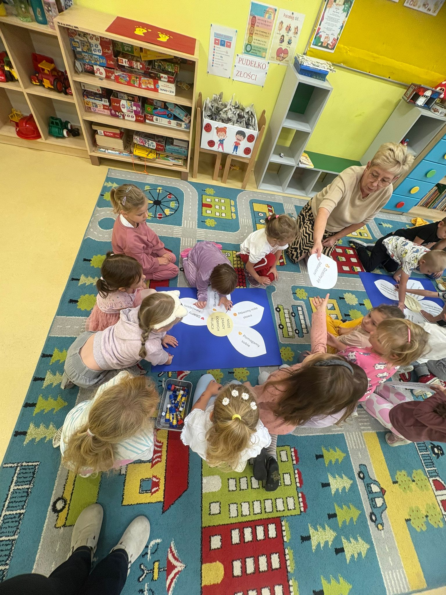 W grupie stokrotki rozmawialiśmy o tym, jak budować dobre relacje z innymi. Dzieci dzieliły się pomysłami, jak być dobrym przyjacielem — mówiły o dzieleniu się, pomaganiu i miłych słowach. Na zakończenie stworzyliśmy wspólną pracę plastyczną: Stokrotkę Dobrych Relacji . Każdy płatek to jedna zasada przyjaźni, wymyślona przez dzieci.