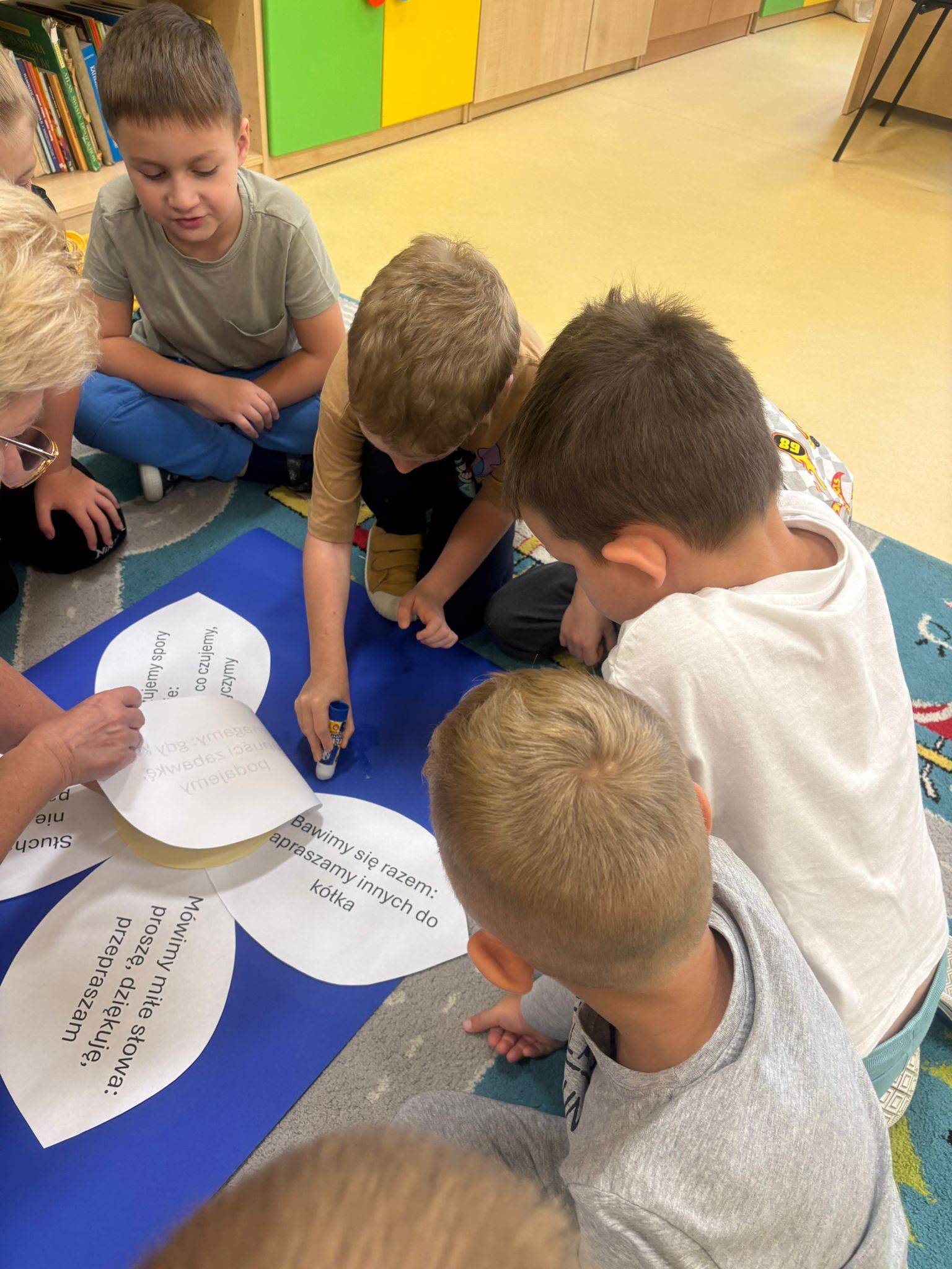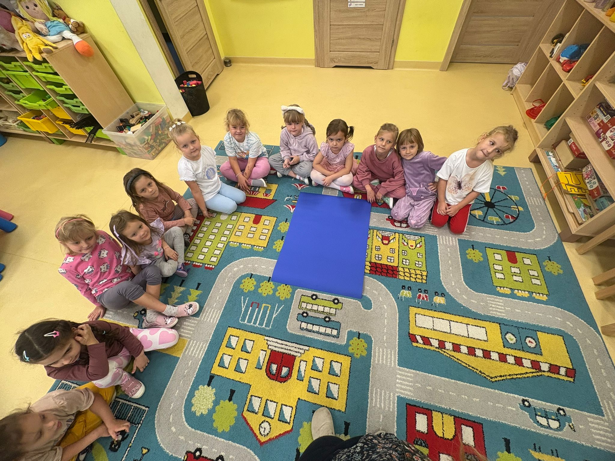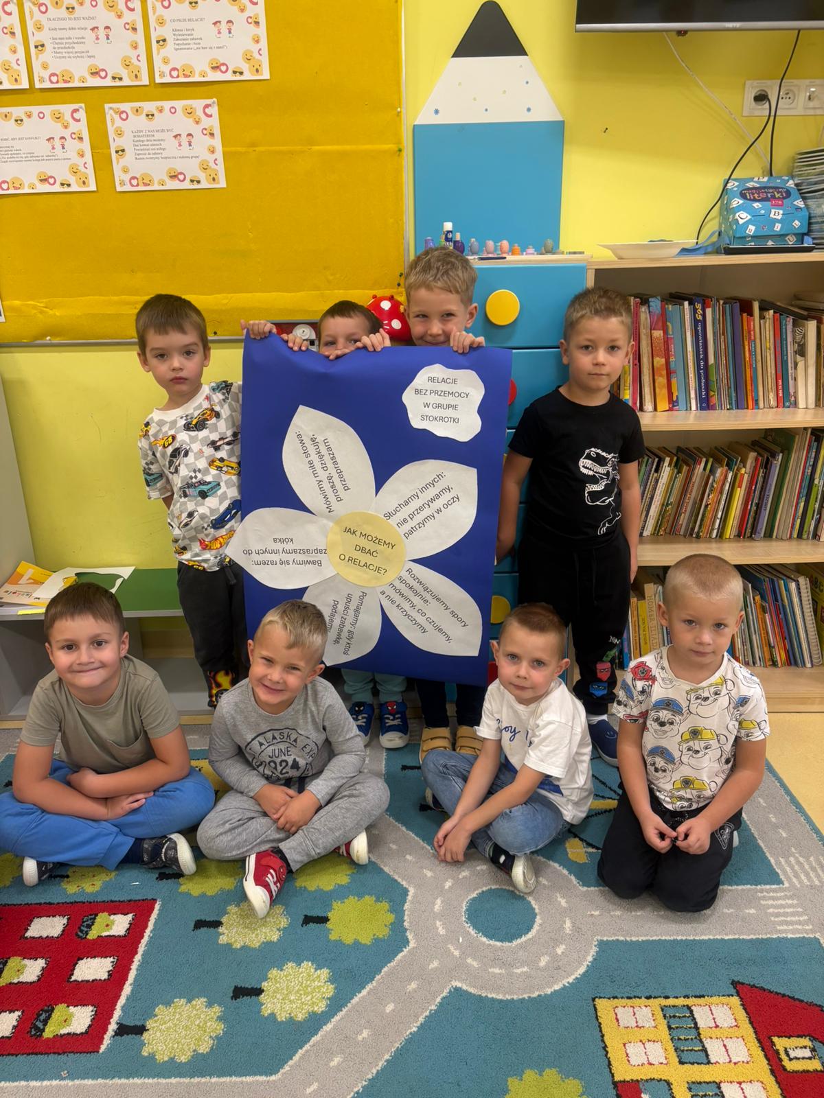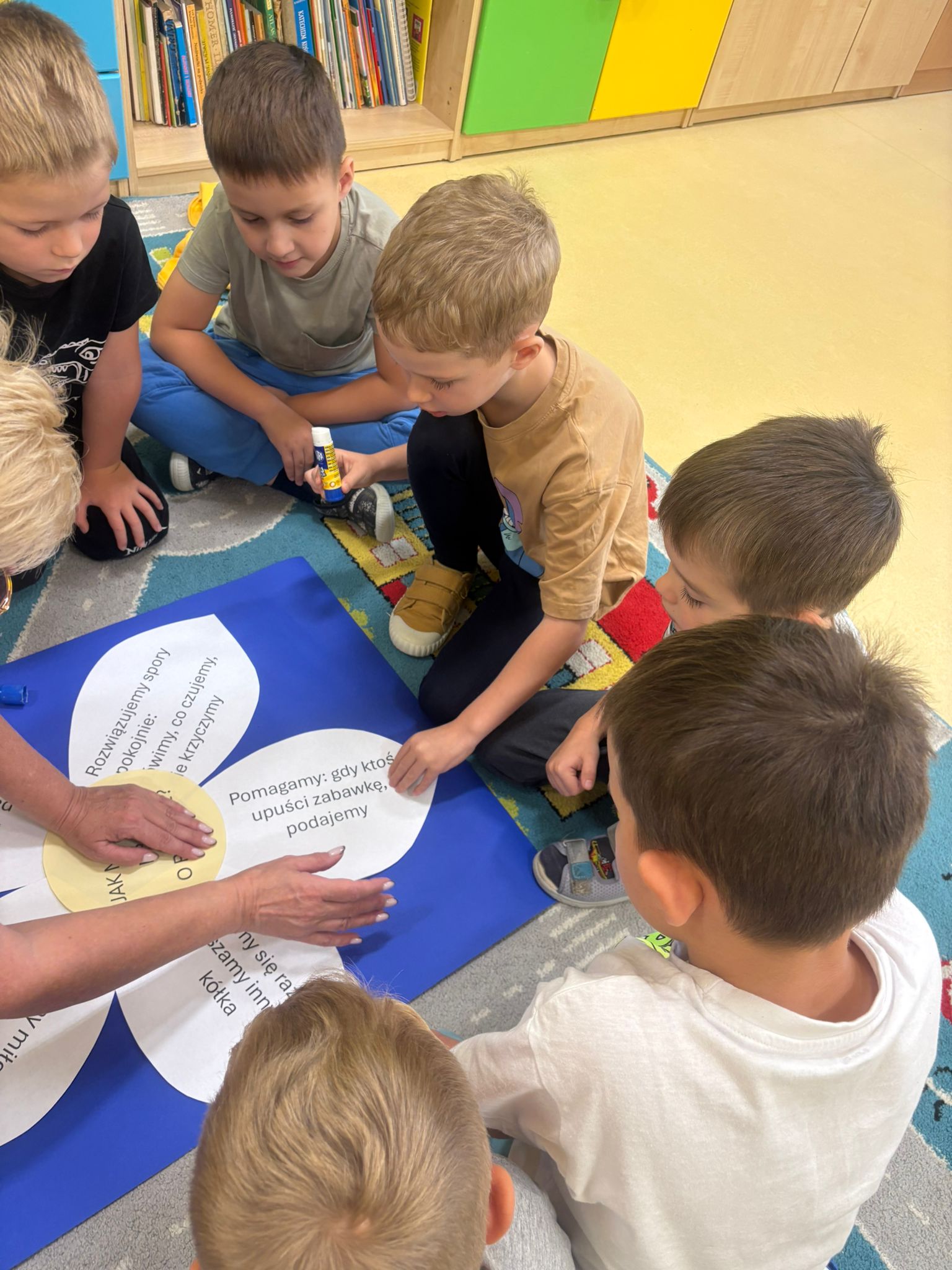 W grupie stokrotki rozmawialiśmy o tym, jak budować dobre relacje z innymi. Dzieci dzieliły się pomysłami, jak być dobrym przyjacielem — mówiły o dzieleniu się, pomaganiu i miłych słowach. Na zakończenie stworzyliśmy wspólną pracę plastyczną: Stokrotkę Dobrych Relacji . Każdy płatek to jedna zasada przyjaźni, wymyślona przez dzieci.
