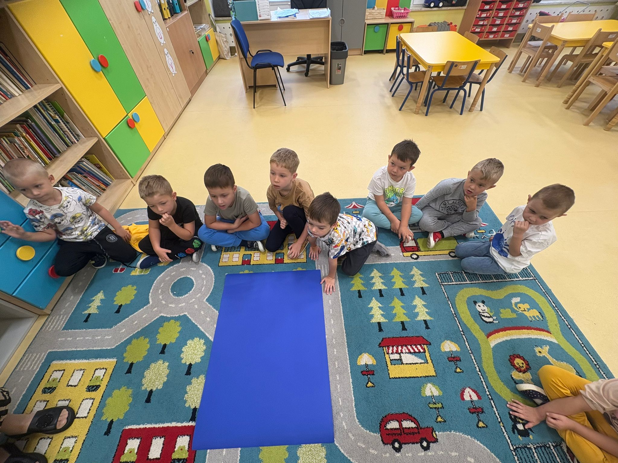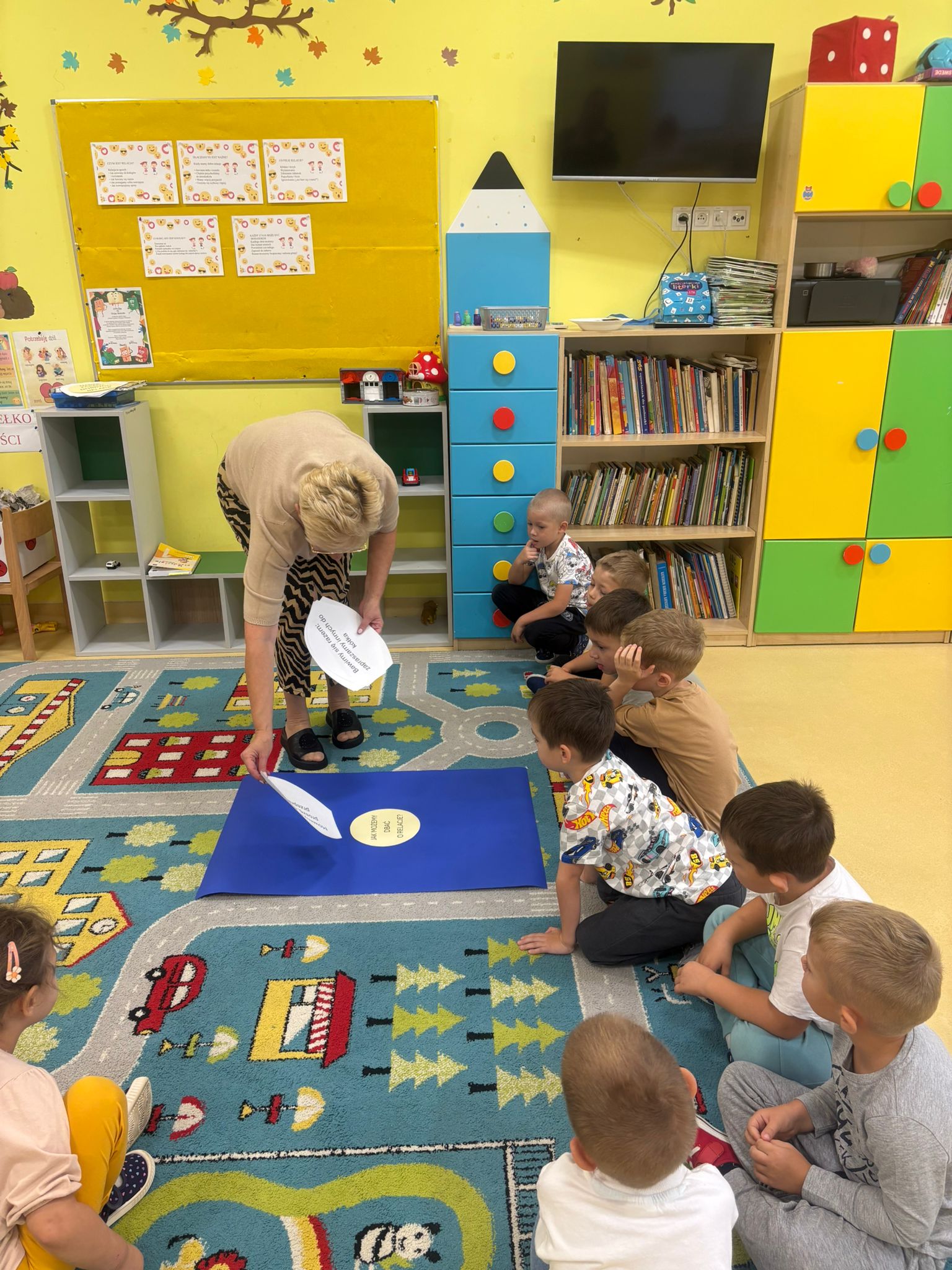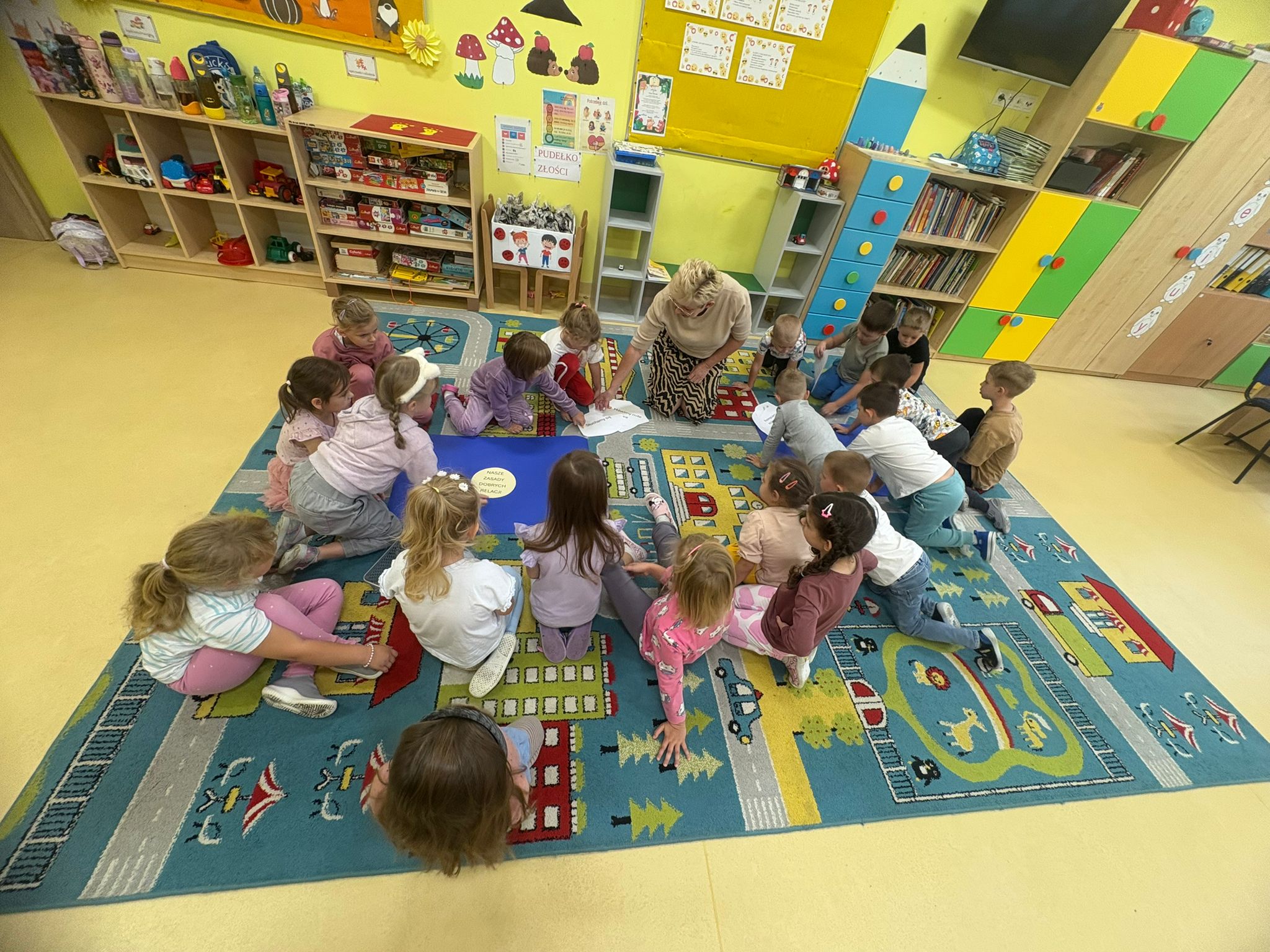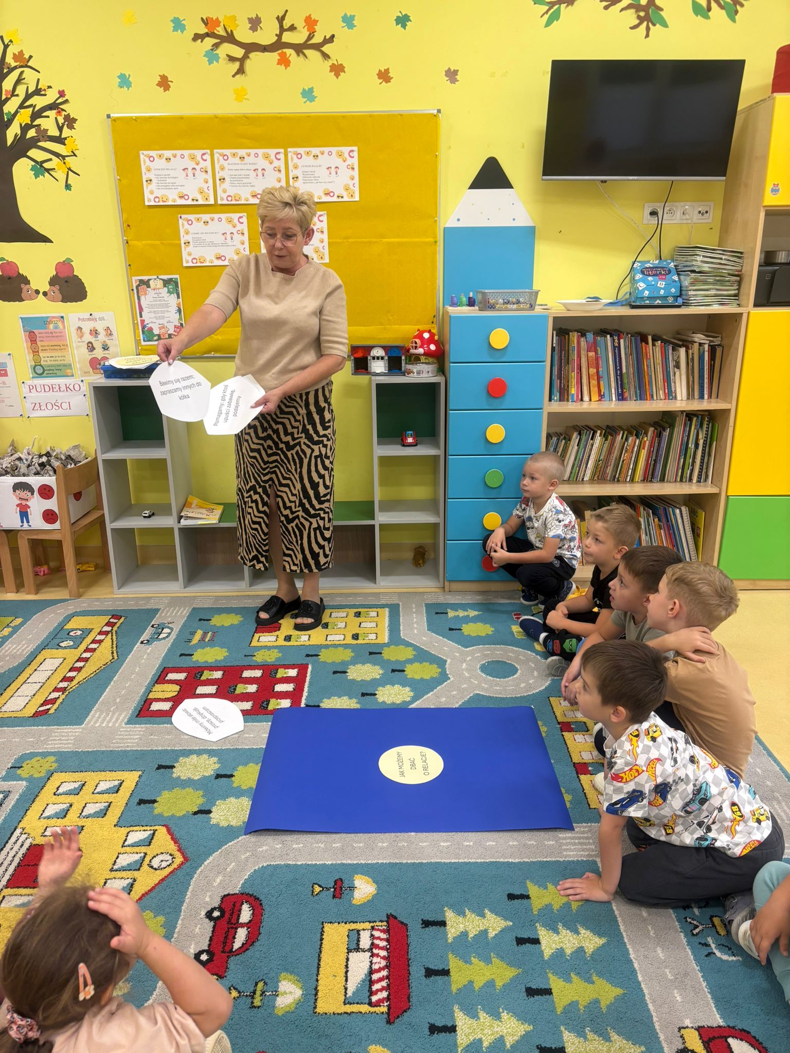 W grupie stokrotki rozmawialiśmy o tym, jak budować dobre relacje z innymi. Dzieci dzieliły się pomysłami, jak być dobrym przyjacielem — mówiły o dzieleniu się, pomaganiu i miłych słowach. Na zakończenie stworzyliśmy wspólną pracę plastyczną: Stokrotkę Dobrych Relacji . Każdy płatek to jedna zasada przyjaźni, wymyślona przez dzieci.