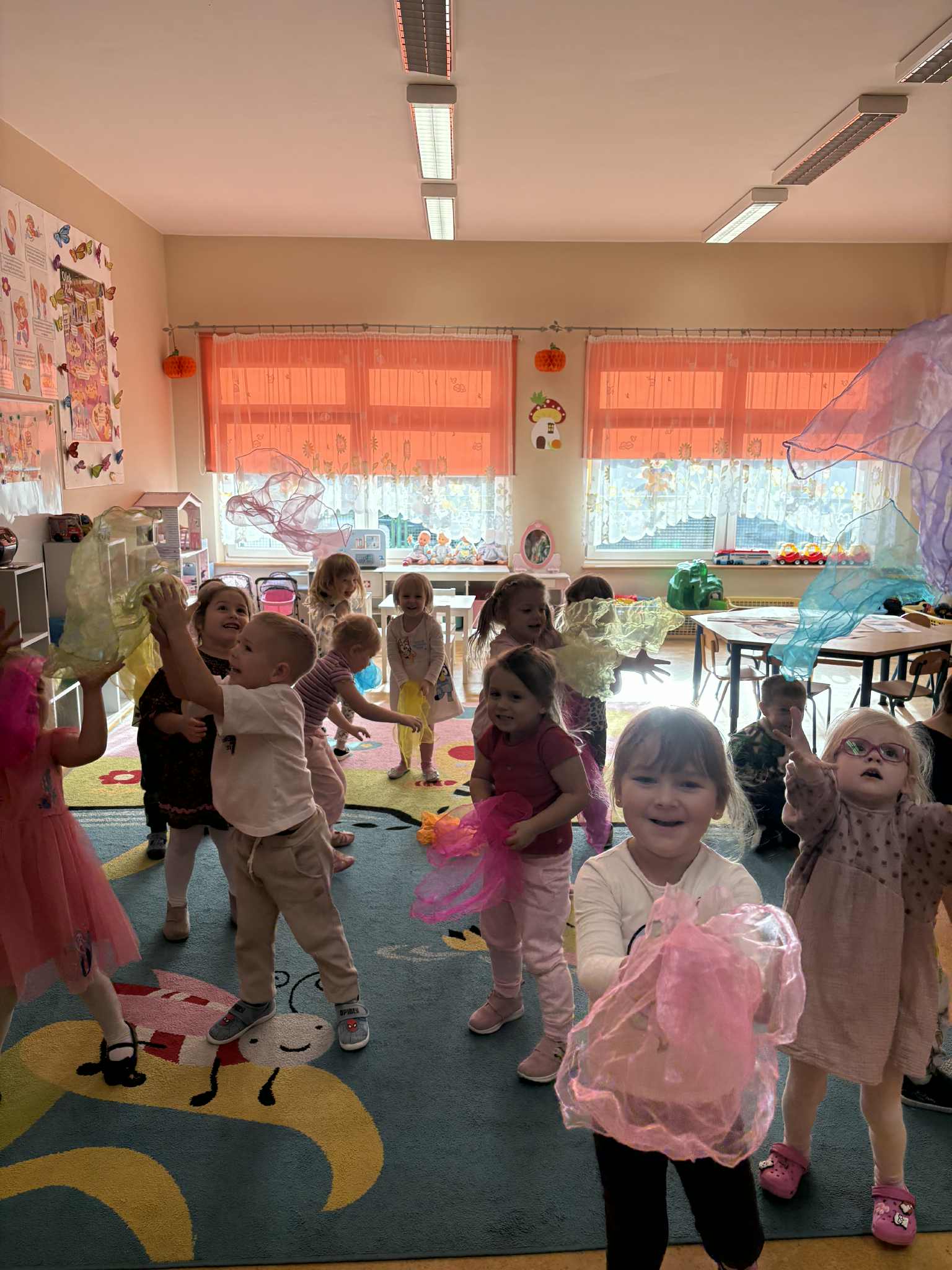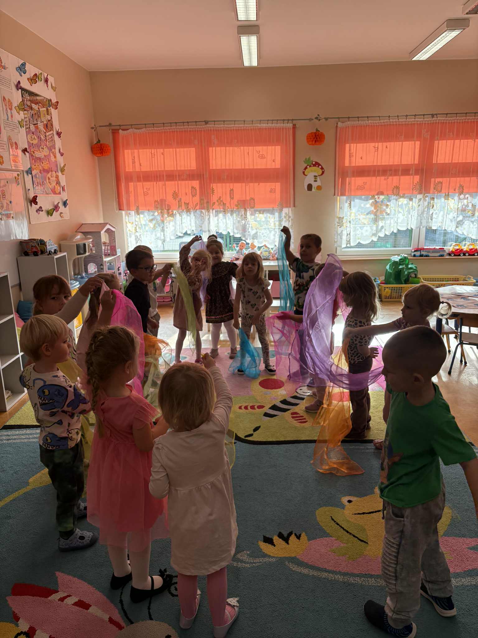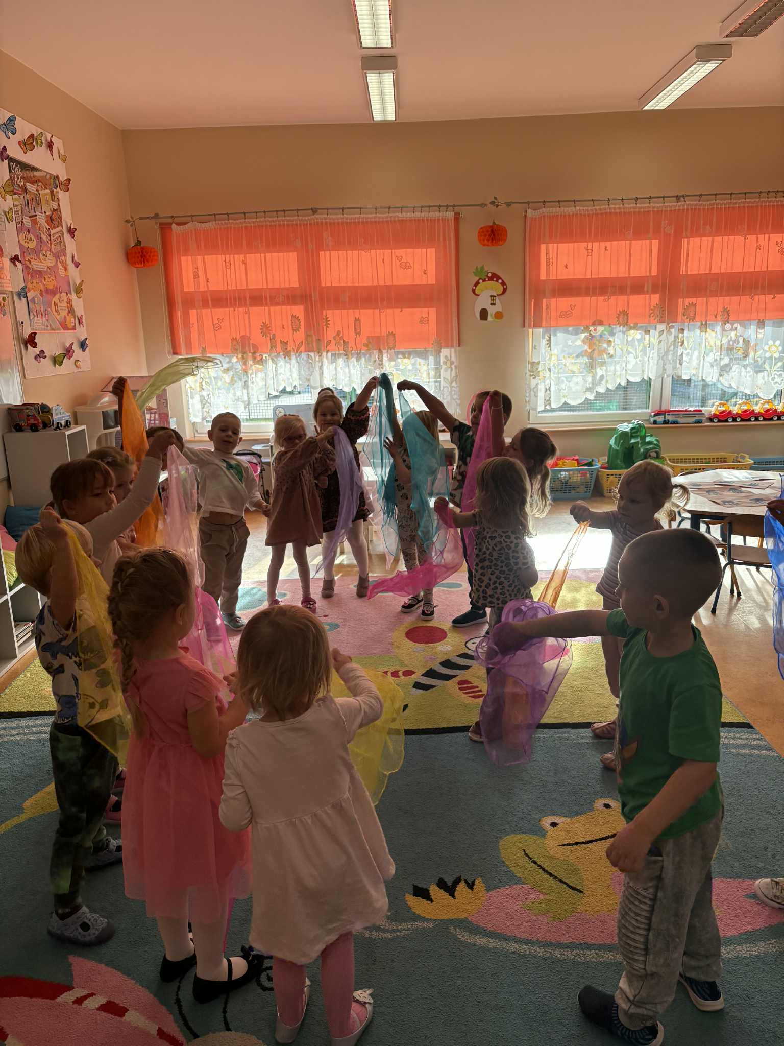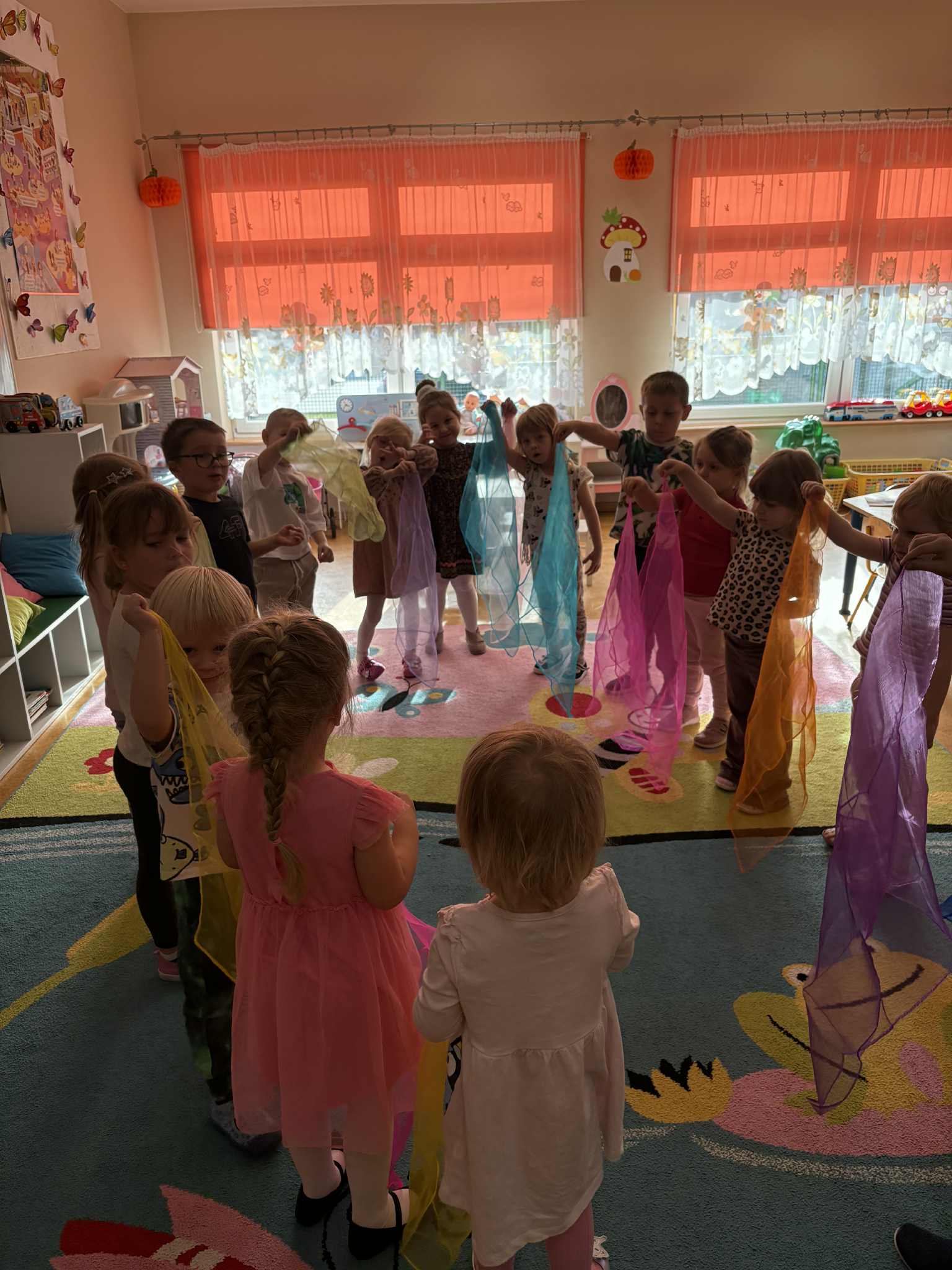 Dzieci z Przedszkola Samorządowego w Gorzkowicach wysłuchały drugiej bajki ,,Magiczne uczucie po występie ". Poznały nową emocję - wzruszenie. Przedszkolaki wykonały w grupach zadanie plastyczne ,,Serce wzruszeń" , malowały farbami słuchając utworu muzycznego oraz zatańczyły „ Taniec motyli” z chustami i taniec „Serce wzruszeń” ze wstążkami.