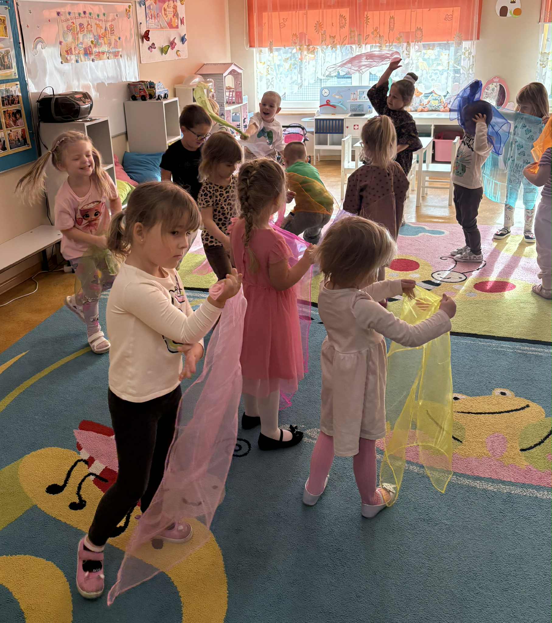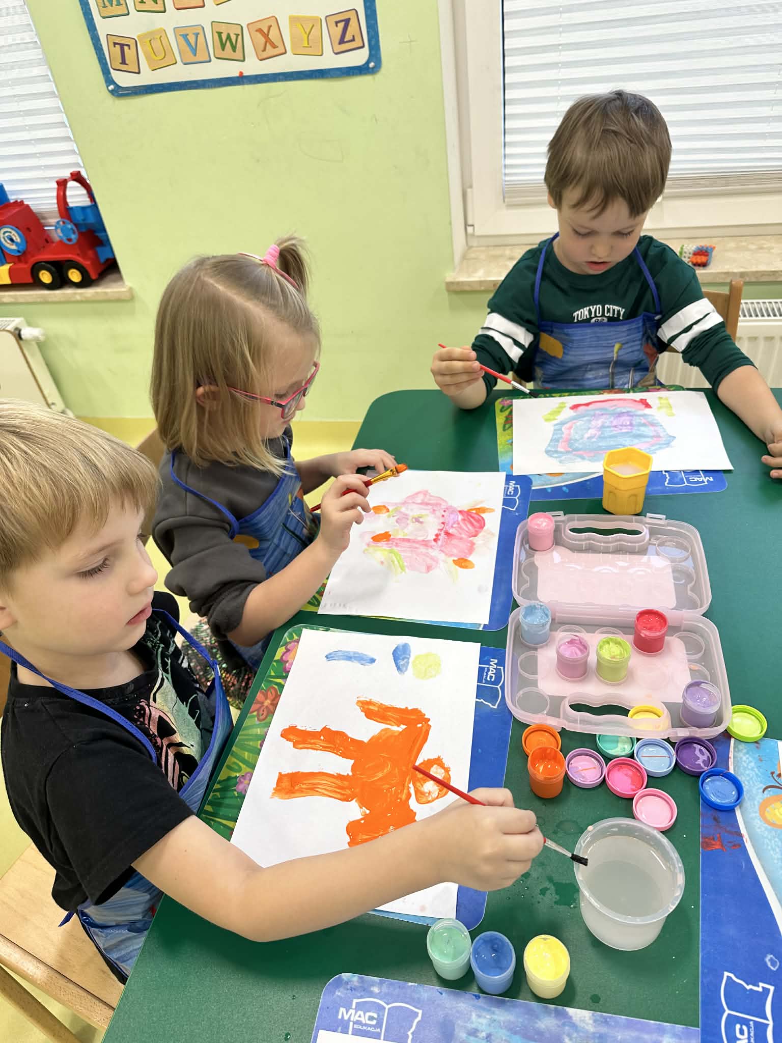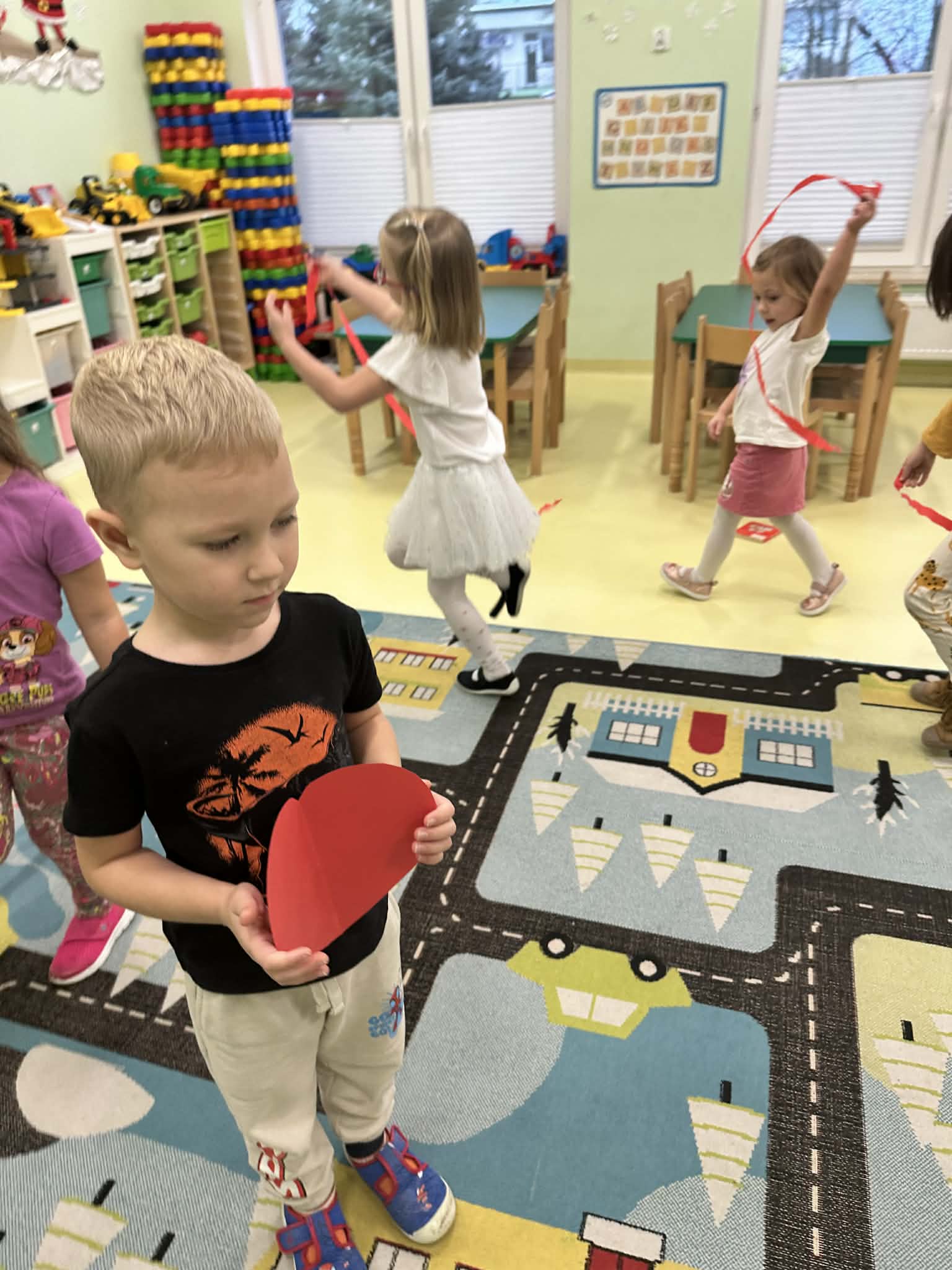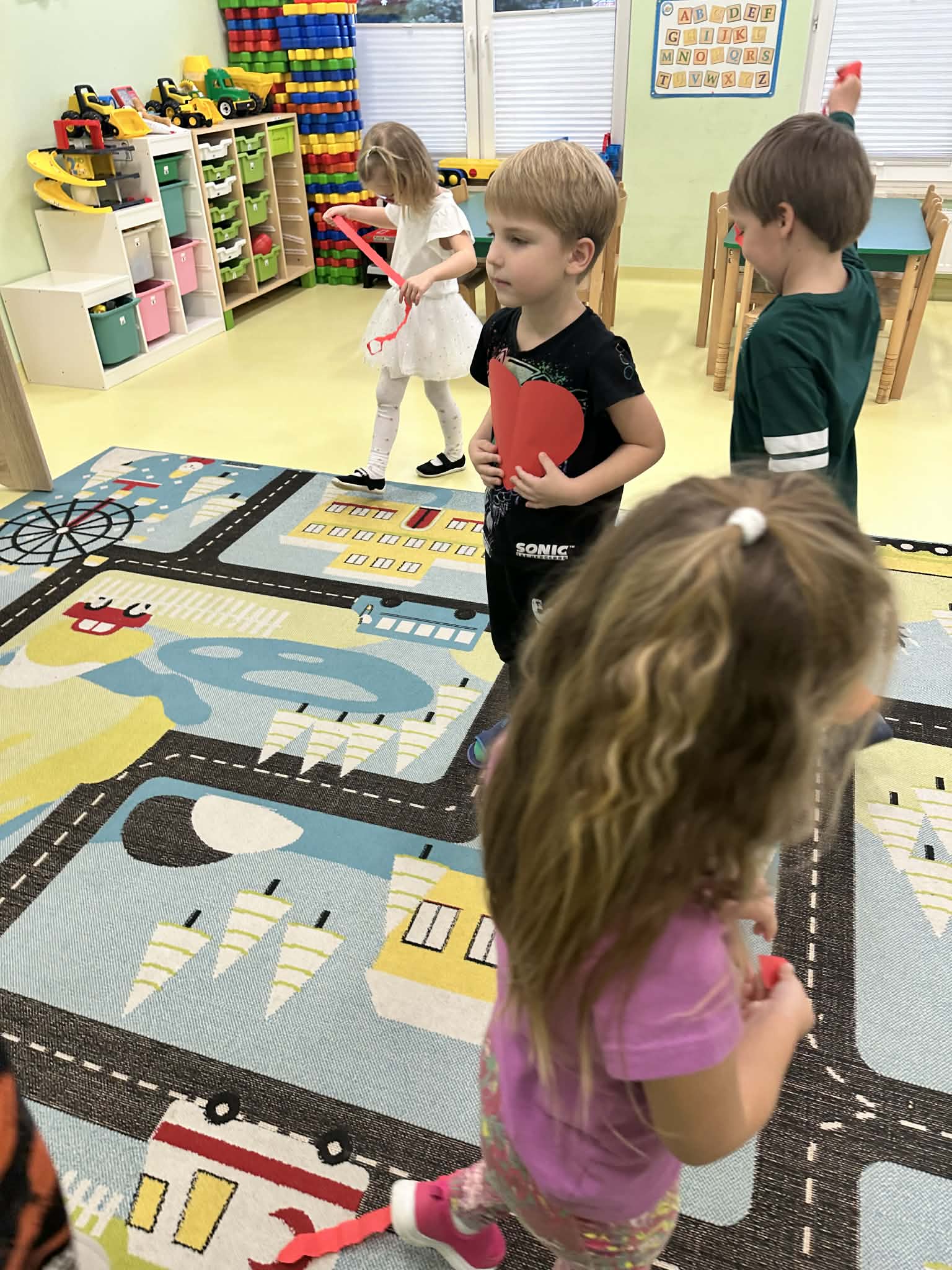 Dzieci z Przedszkola Samorządowego w Gorzkowicach wysłuchały drugiej bajki ,,Magiczne uczucie po występie ". Poznały nową emocję - wzruszenie. Przedszkolaki wykonały w grupach zadanie plastyczne ,,Serce wzruszeń" , malowały farbami słuchając utworu muzycznego oraz zatańczyły „ Taniec motyli” z chustami i taniec „Serce wzruszeń” ze wstążkami.