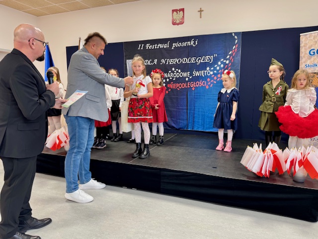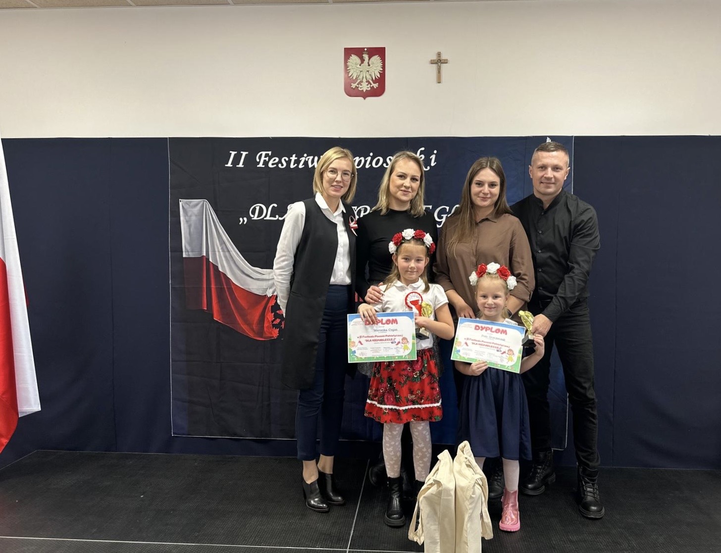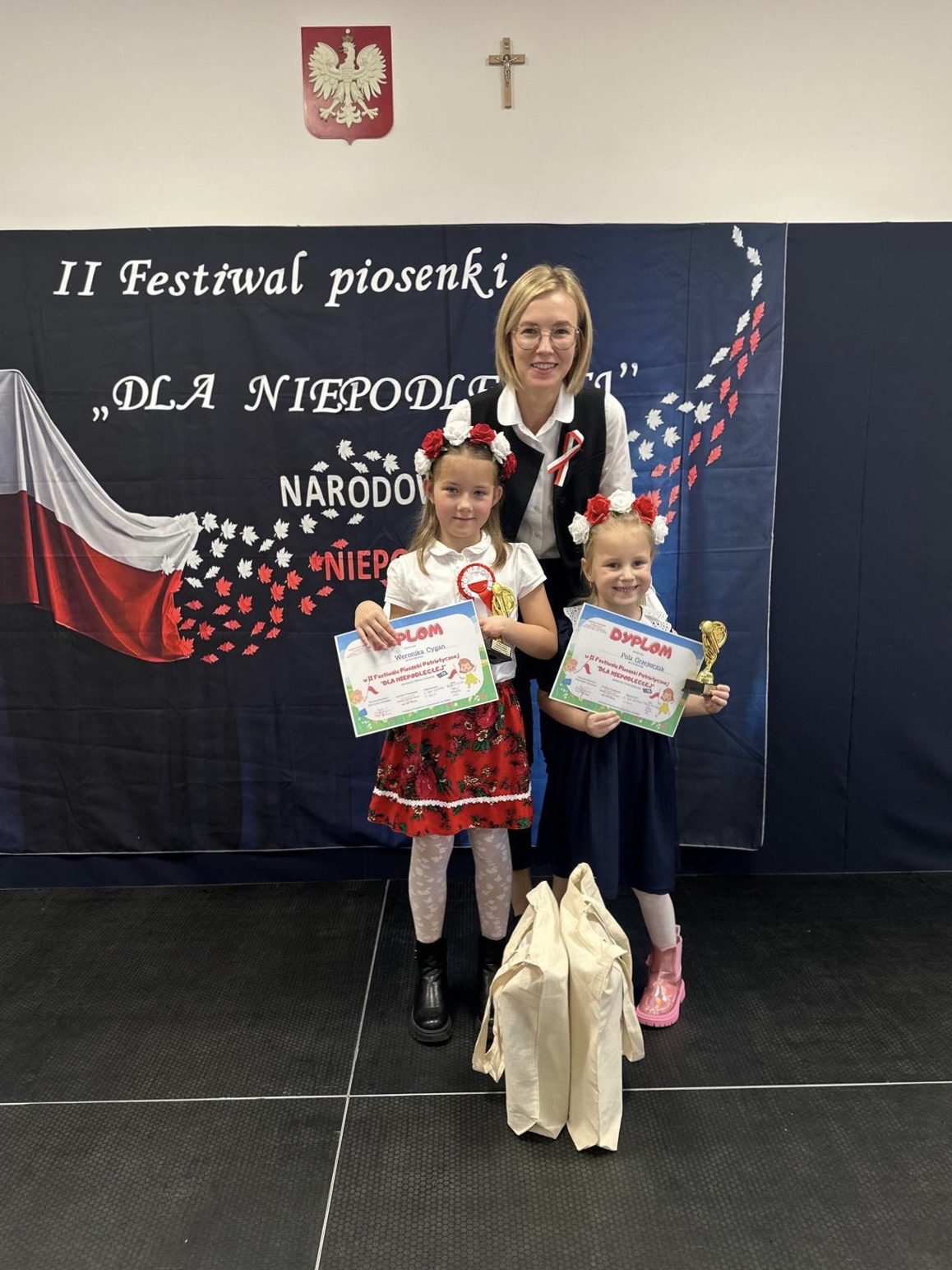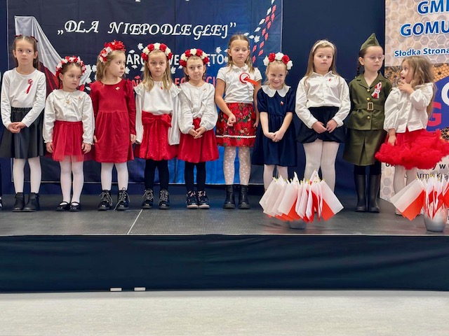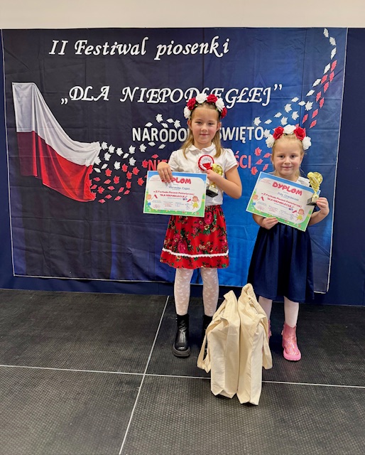 Z radością informujemy, że dwie nasze wychowanki Pola Grzejszczak i Weronika Cygan wzięły udział w konkursie wokalnym „Dla Niepodległej”, zorganizowanym przez Przedszkole Samorządowe w Gomunicach. Dziewczynki pięknie zaprezentowały przygotowane