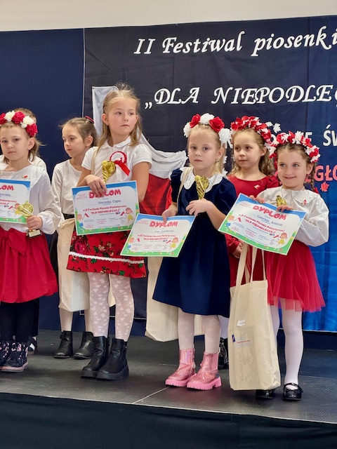 utwory o tematyce patriotycznej, wykazując się odwagą, muzykalnością i dużym zaangażowaniem. Ich występy były pełne emocji i stanowiły wyjątkowy wyraz szacunku dla Ojczyzny. Miło nam także przekazać, że wszyscy uczestnicy konkursu zostali wyróżnieni