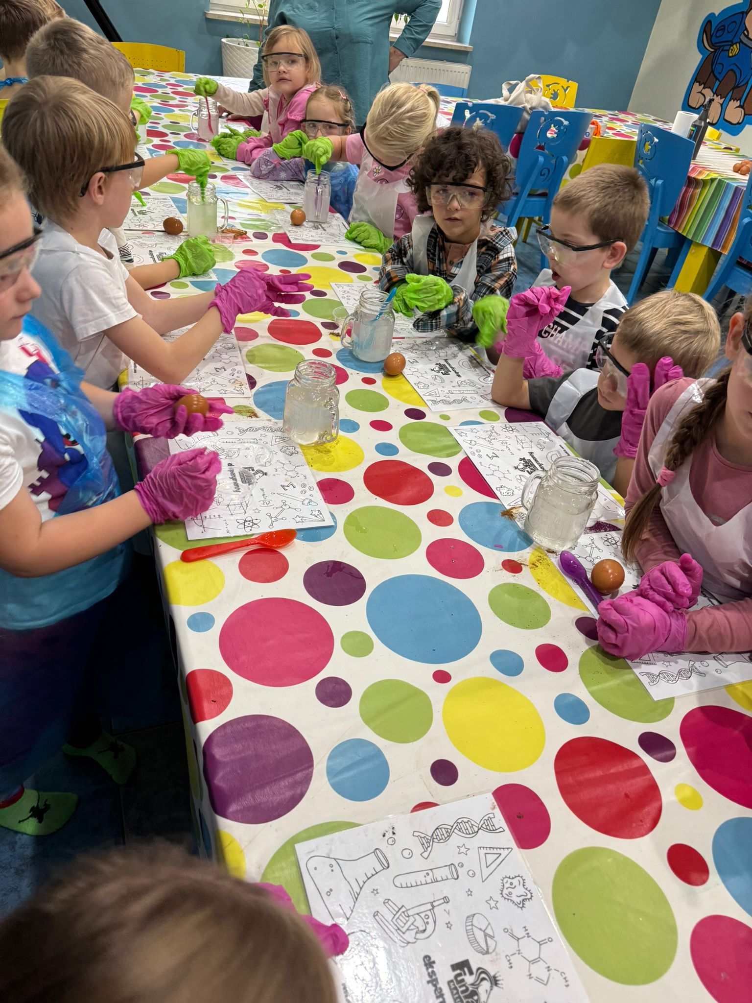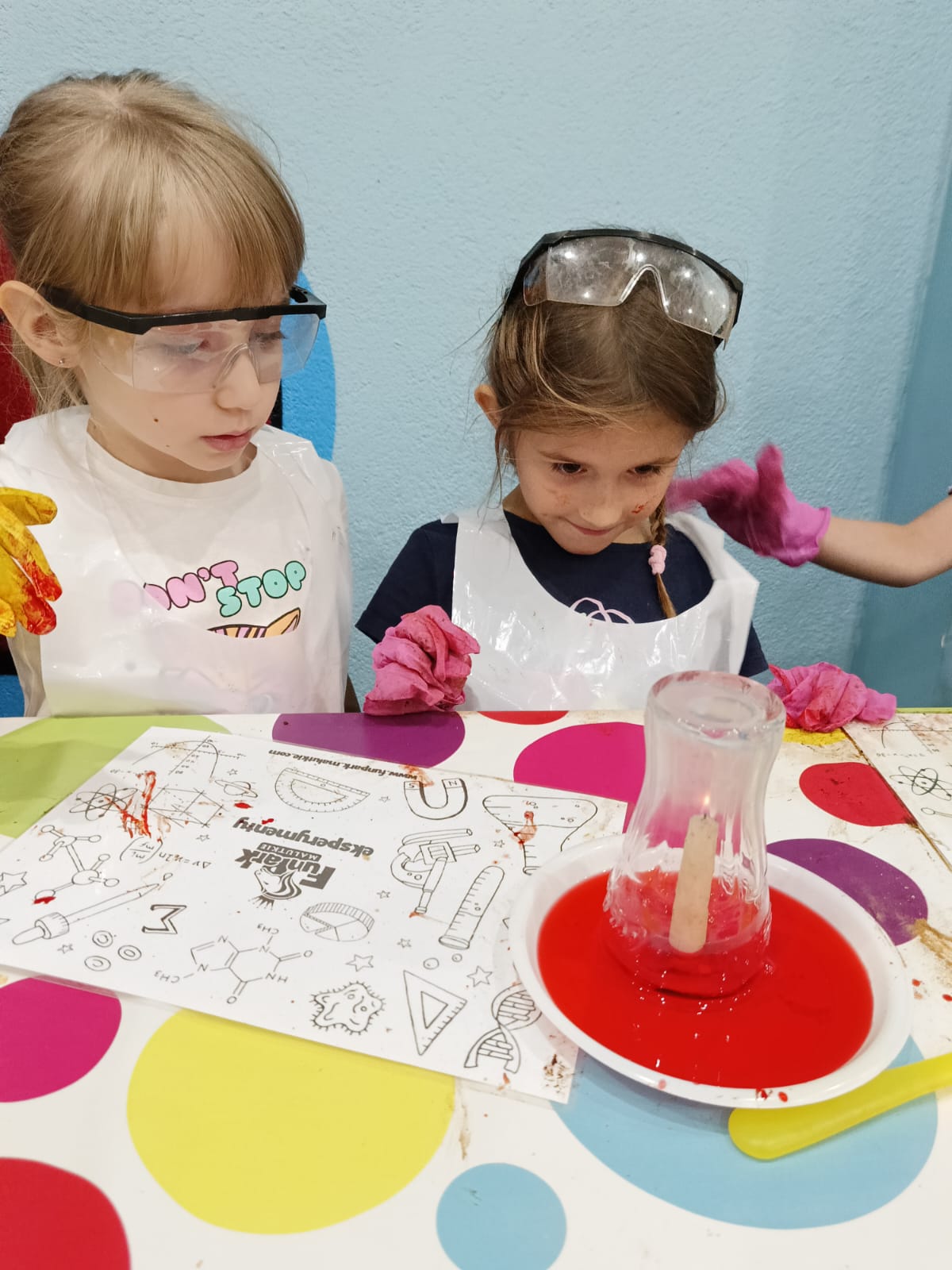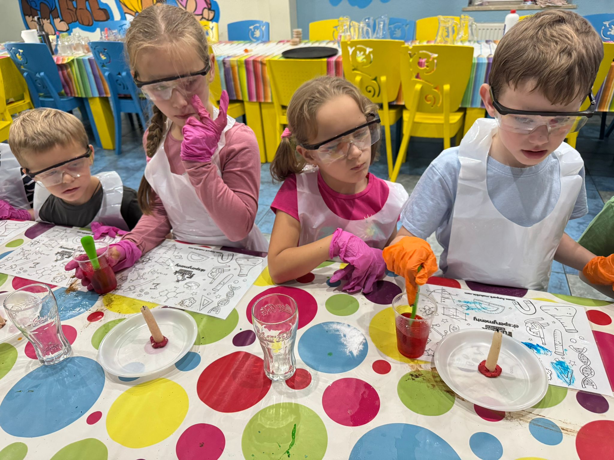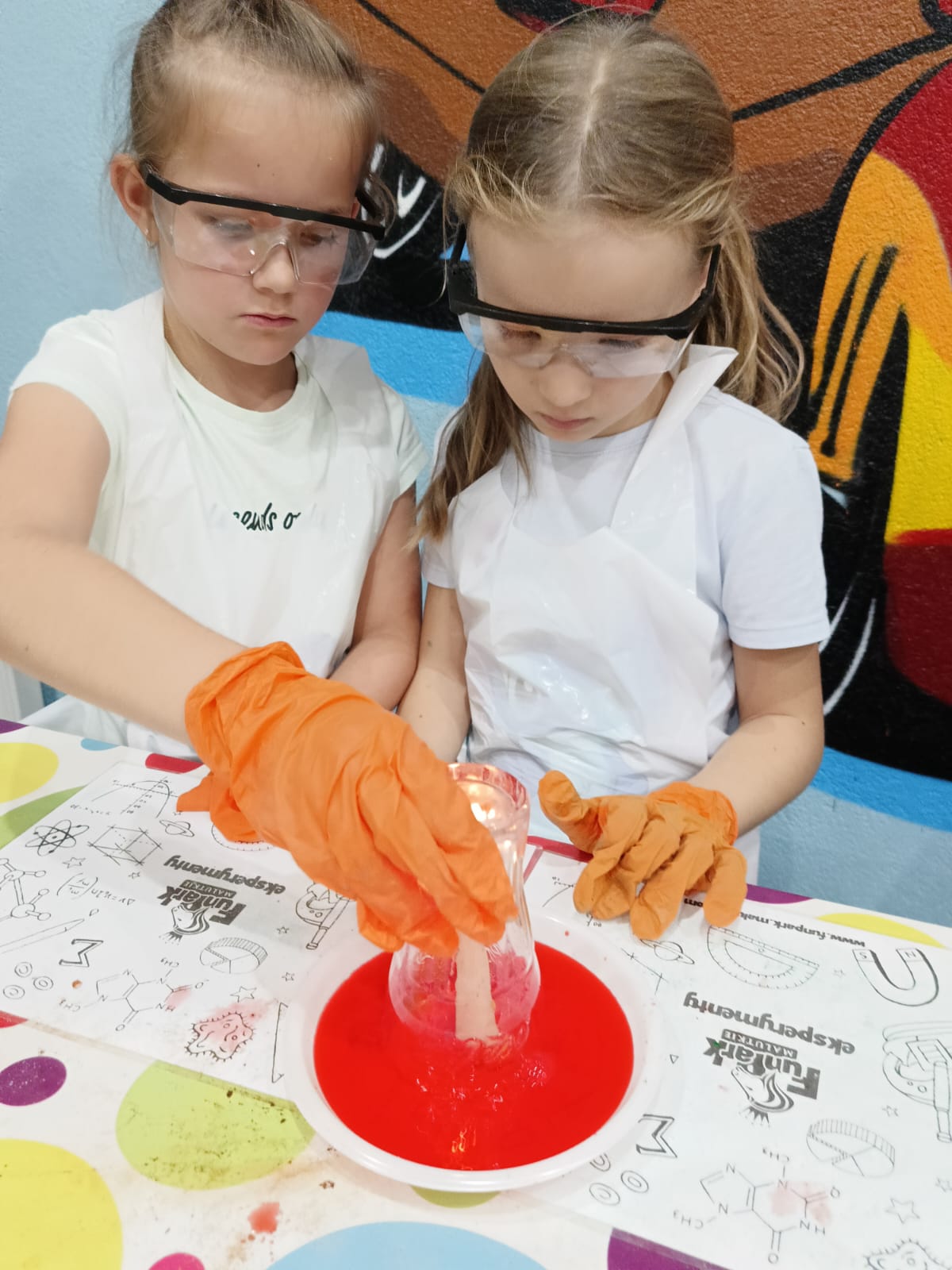 z fizyki i chemii. Dzieci zabezpieczone w okulary, fartuszki i rękawiczki przystąpiły do cyklu doświadczeń takich, jak: pływające jajko, suchy palec w wodzie, kolorowy pieniący się wulkan, gasnąca pod przykryciem świeczka, czy rafa koralowa.