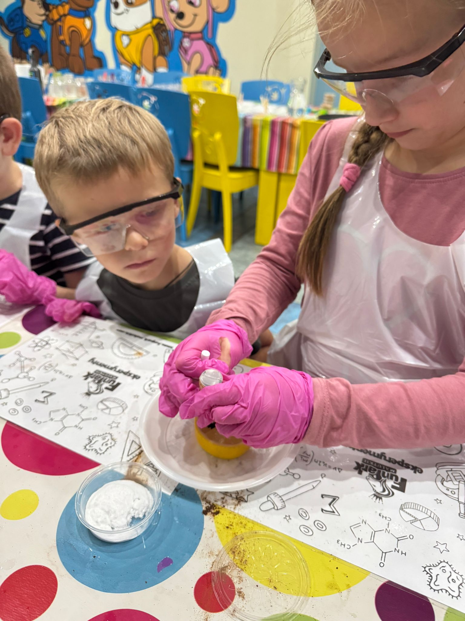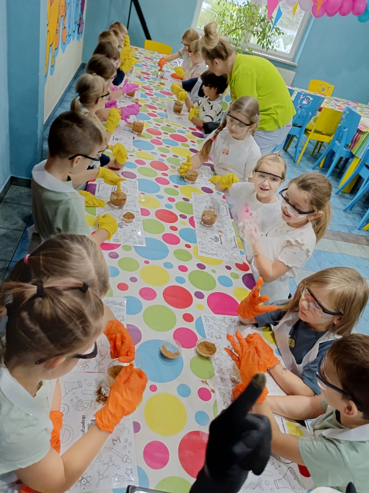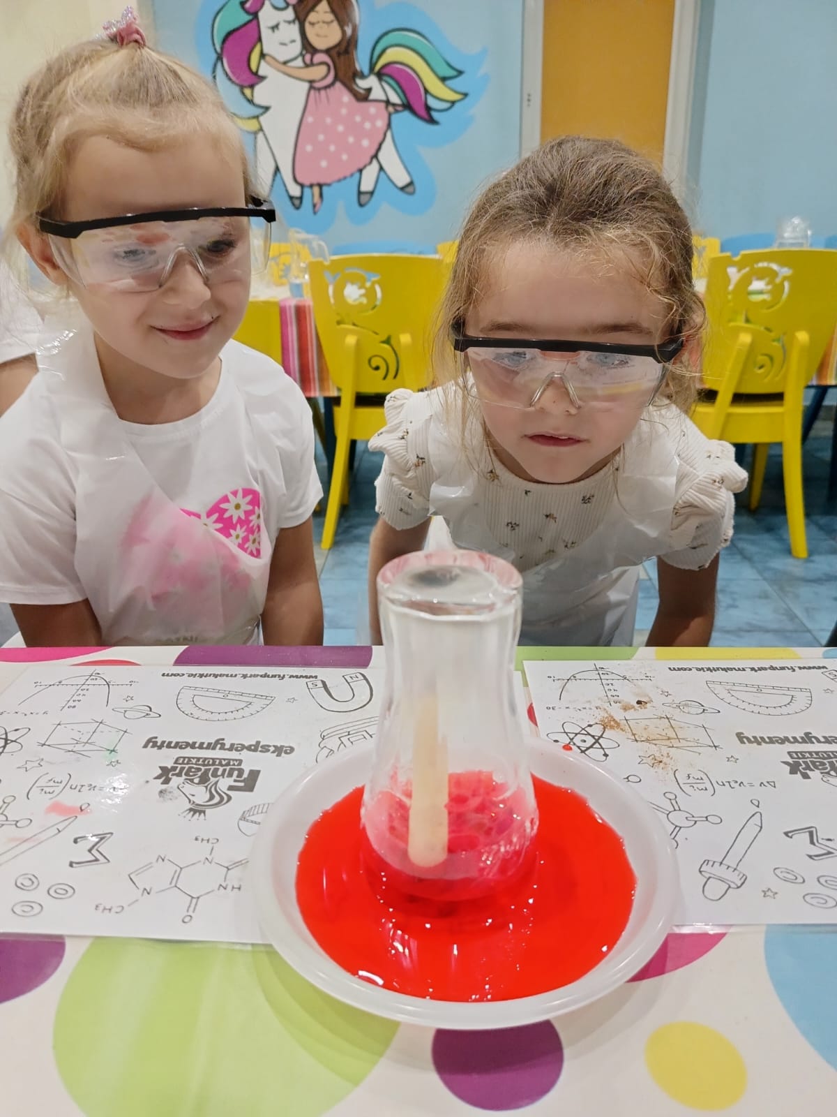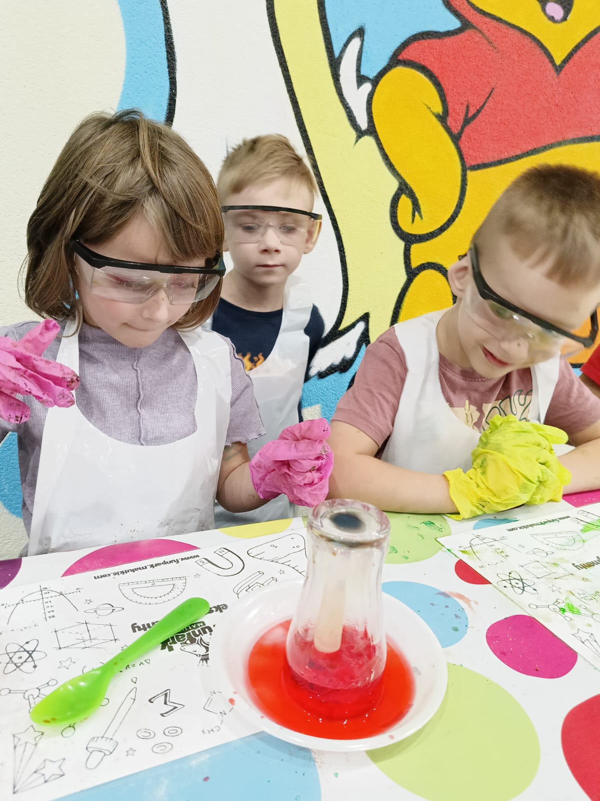 z fizyki i chemii. Dzieci zabezpieczone w okulary, fartuszki i rękawiczki przystąpiły do cyklu doświadczeń takich, jak: pływające jajko, suchy palec w wodzie, kolorowy pieniący się wulkan, gasnąca pod przykryciem świeczka, czy rafa koralowa.