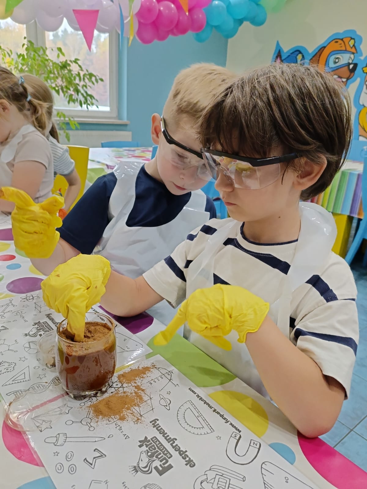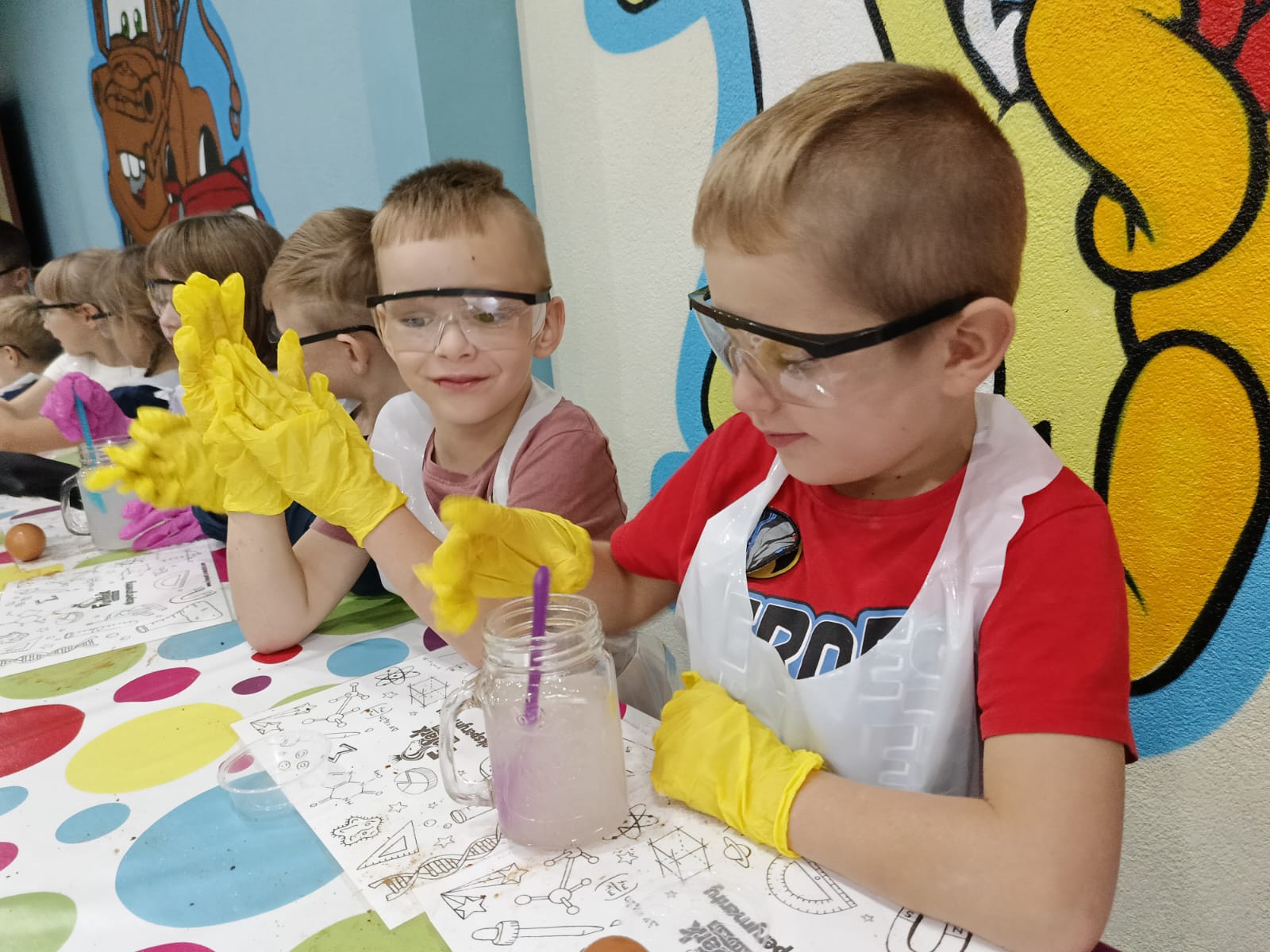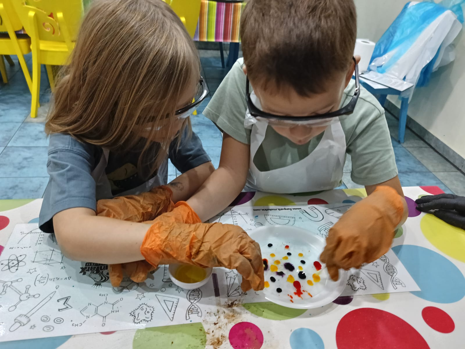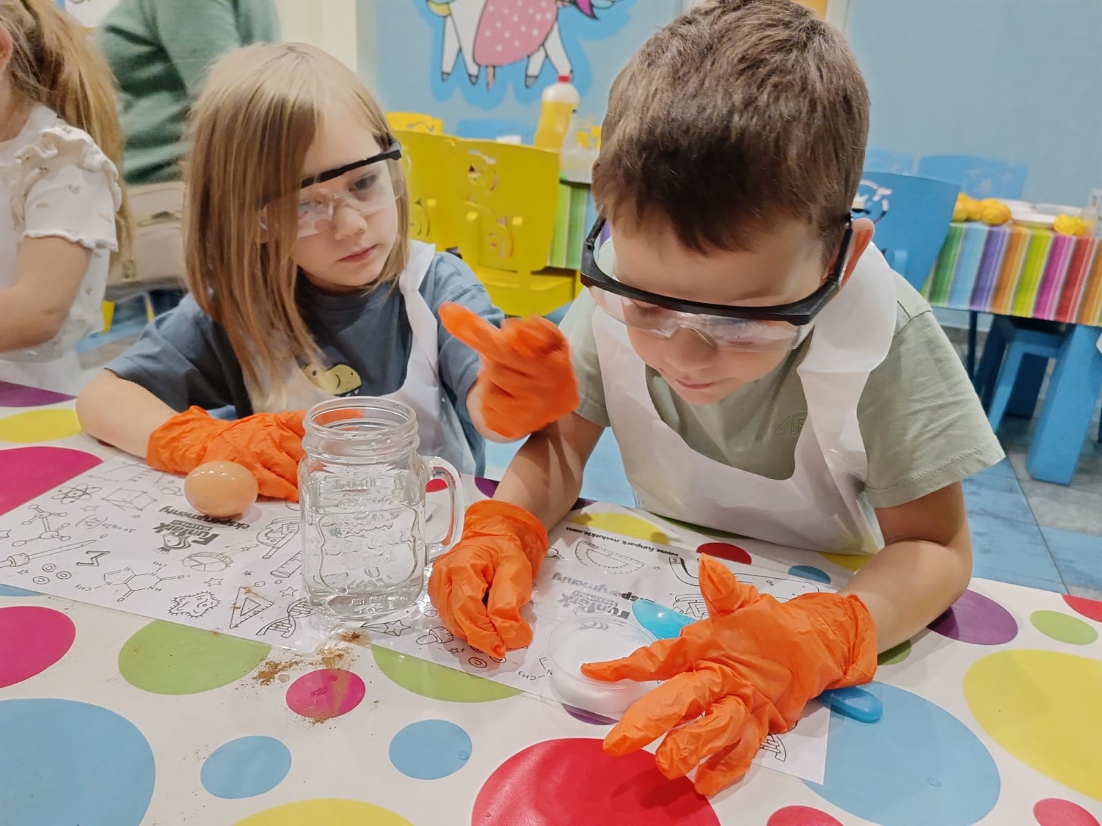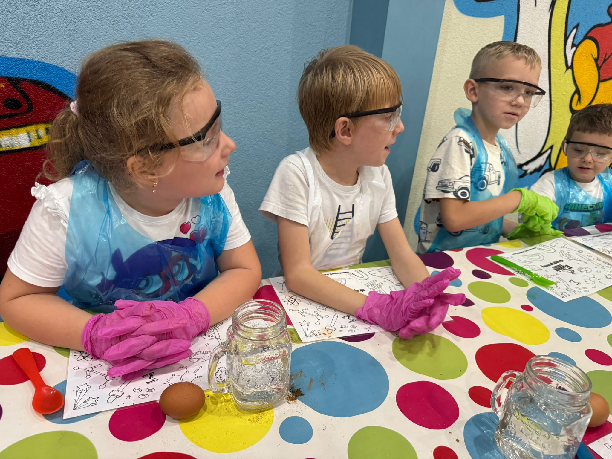 z fizyki i chemii. Dzieci zabezpieczone w okulary, fartuszki i rękawiczki przystąpiły do cyklu doświadczeń takich, jak: pływające jajko, suchy palec w wodzie, kolorowy pieniący się wulkan, gasnąca pod przykryciem świeczka, czy rafa koralowa.