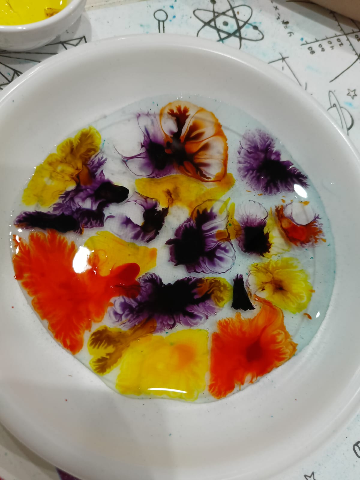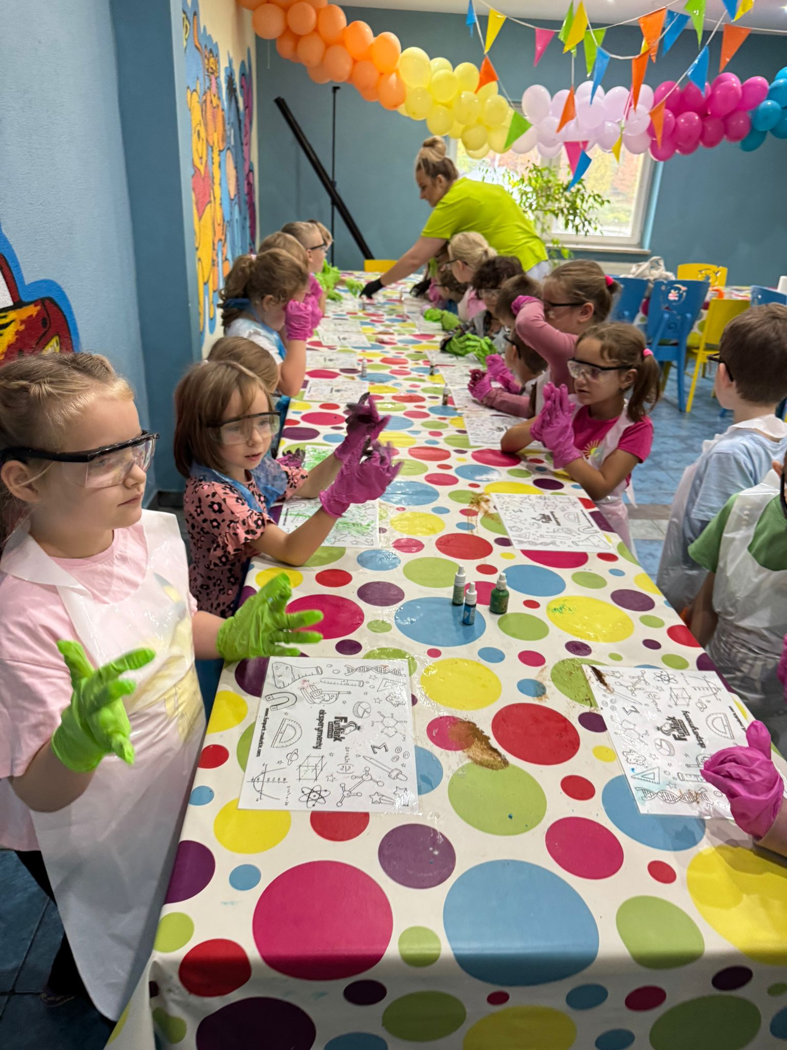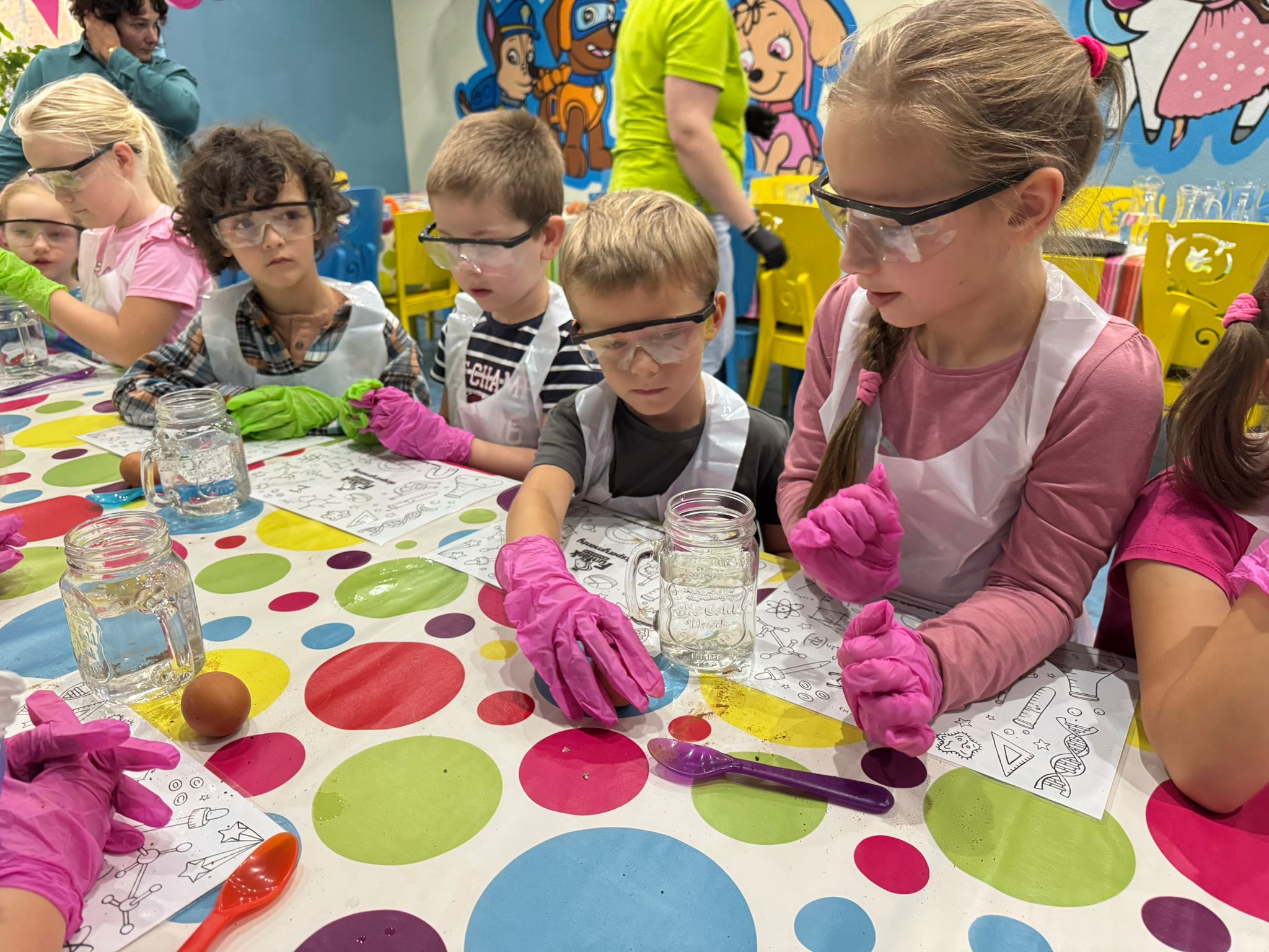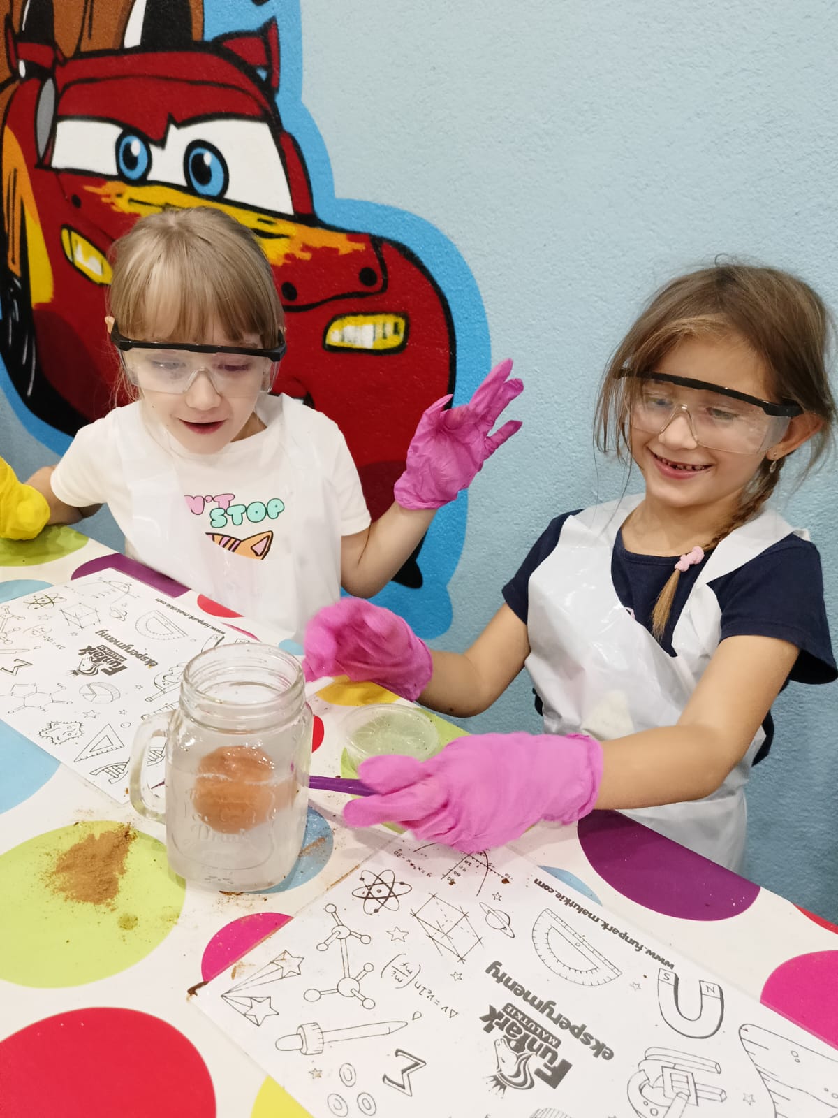 z fizyki i chemii. Dzieci zabezpieczone w okulary, fartuszki i rękawiczki przystąpiły do cyklu doświadczeń takich, jak: pływające jajko, suchy palec w wodzie, kolorowy pieniący się wulkan, gasnąca pod przykryciem świeczka, czy rafa koralowa.