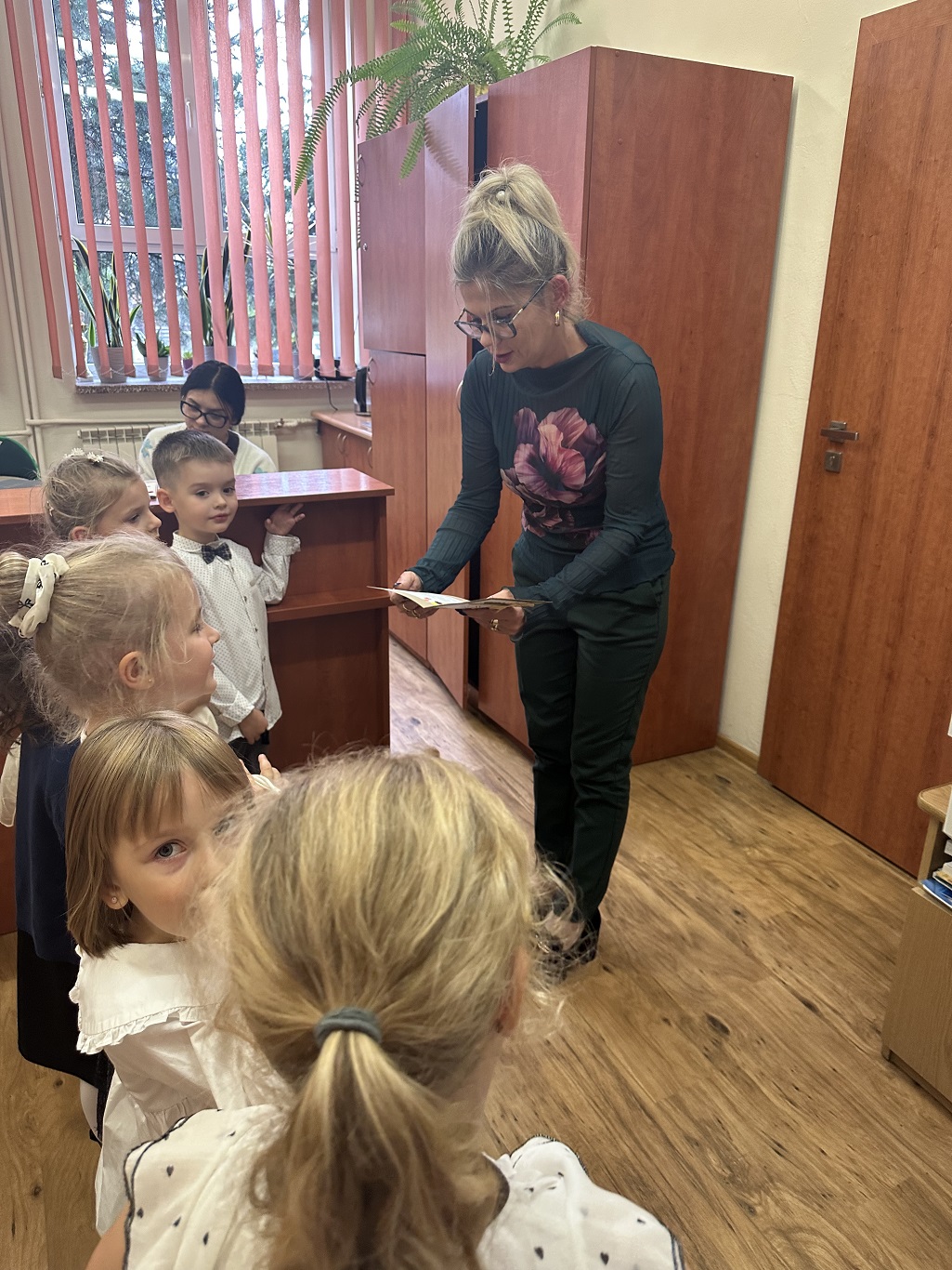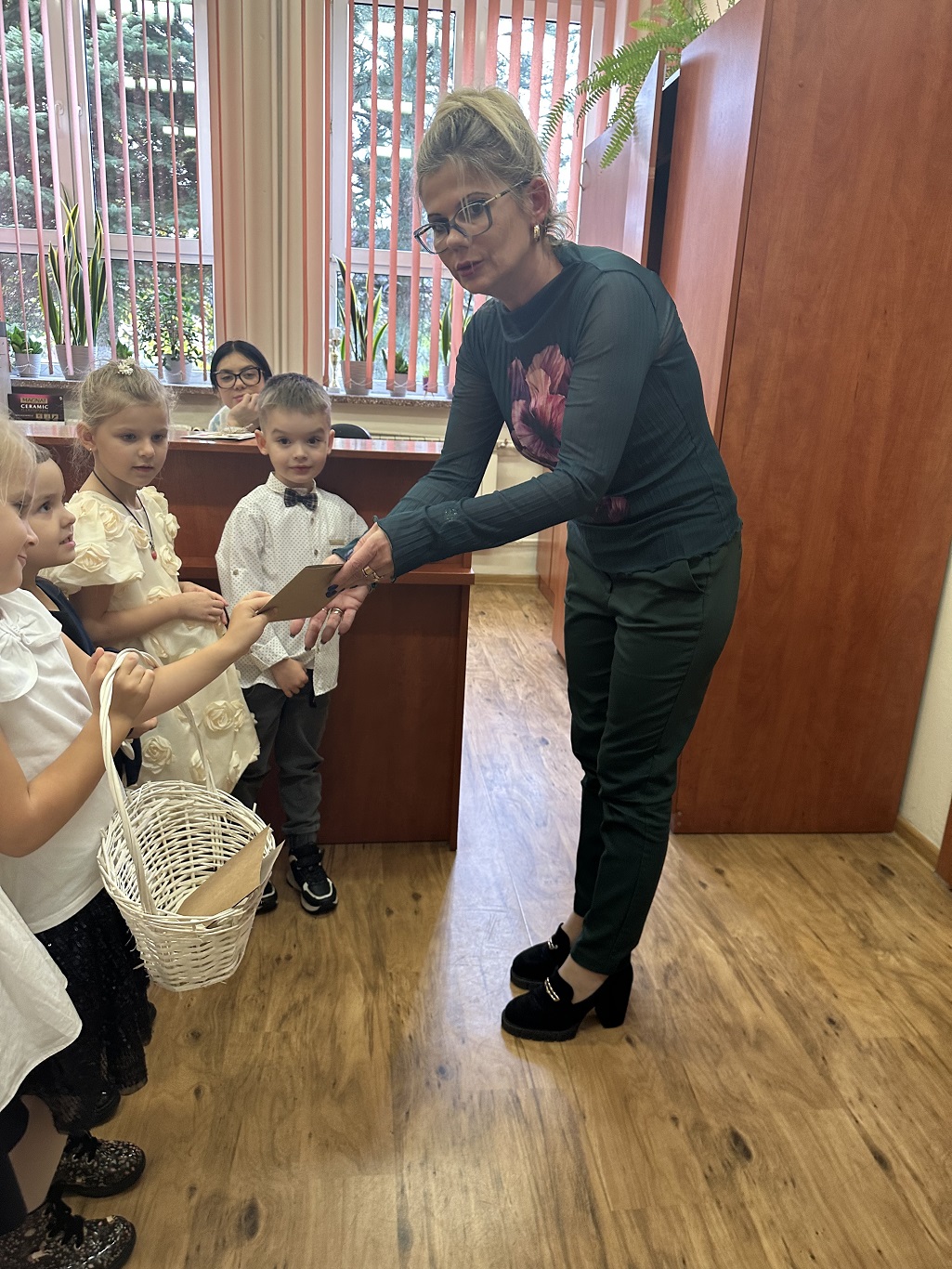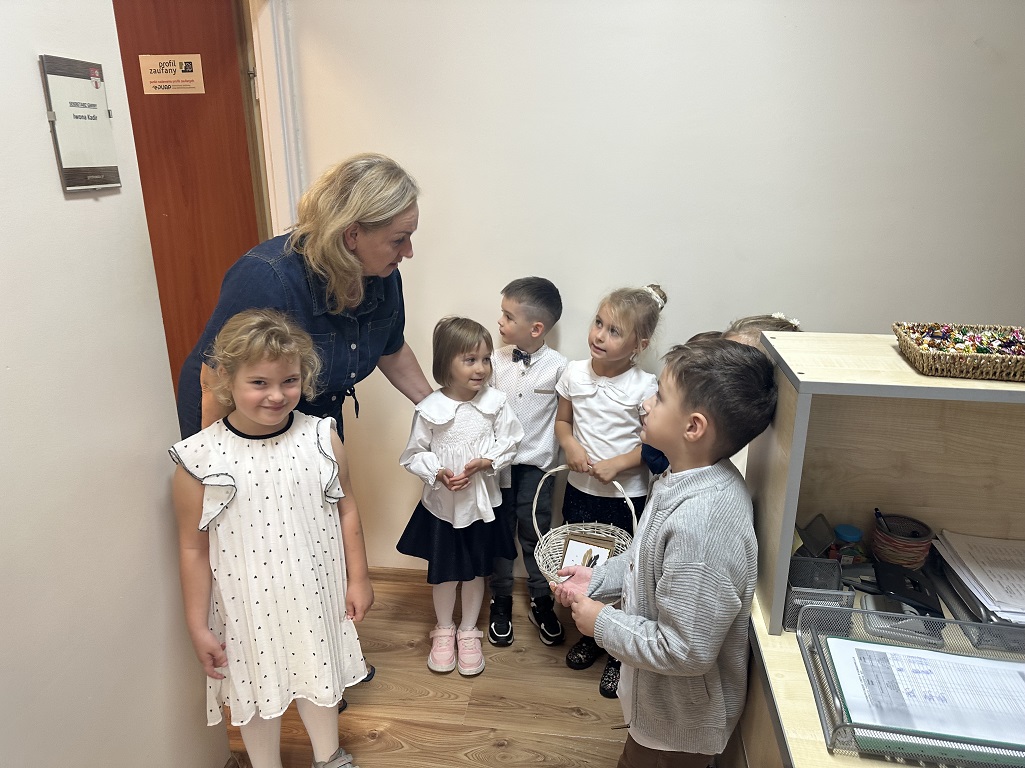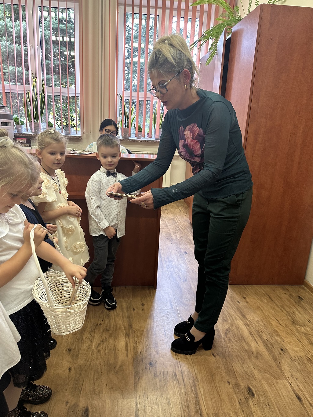 Dnia 10 października przedstawiciele dzieci z grupy „Stokrotki” z Przedszkola Samorządowego w Gorzkowicach wybrały się z wizytą do Urzędu Gminy, Administracji Placówek Oświatowych oraz Szkoły Podstawowej w Gorzkowicach. Celem wyjścia było złożenie życzeń z okazji Święta Edukacji Narodowej. Przedszkolaki przekazały na ręce Pani Sekretarz Gminy – Iwony Kadir oraz Pani Dyrektor Szkoły Podstawowej – Magdaleny Treścińskiej-Niemczyk okolicznościowe kartki z życzeniami i wyrazami wdzięczności za trud wkładany w codzienną pracę na rzecz dzieci i edukacji. Podczas spotkania mali przedstawiciele przedszkola zaprezentowali krótki wierszyk, który wzbudził uśmiech wśród dorosłych. Dzieci zostały bardzo ciepło przyjęte, a wizyty przebiegły w serdecznej i radosnej atmosferze. Przedszkolaki z dumą reprezentowały swoją grupę i przedszkole, a całe wydarzenie stało się dla nich miłym i pouczającym doświadczeniem.